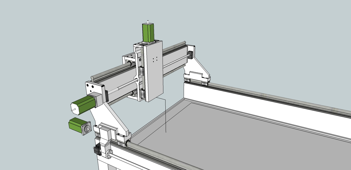 So with Spindle and other attachments like X ballscrew mounts and cables etc you'll probably be pushing 120Kg+.?? . . .At this weight your going to have to be careful with motor tuning using slaved stepper motors. The inertia of this thing at higher feeds will try pushing like crazy so if your thinking to use machine for router type wood work then you may need to consider servo's.?