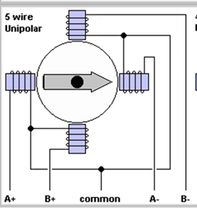 Not 100% sure. . . But I see 5 wires out the motors and where the connectors enter the box there's Green wire with red rings with what looks like a resistor that goes to the daughter board next to the drives. I suspect this is common and the 4 wires on the drive are A+ B+ A- B- like this.