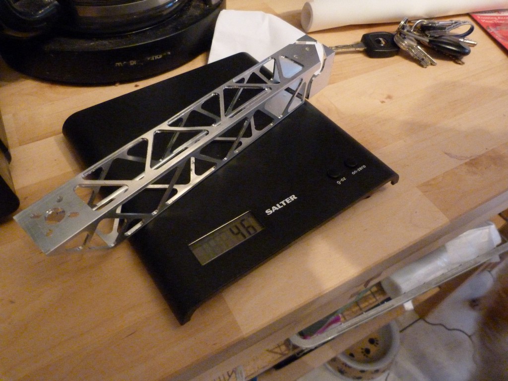 I'm missing a few nuts and bolts but the frame is done! The weight in the photo is 900g and that's with a big 5000mah battery so I've done pretty well.