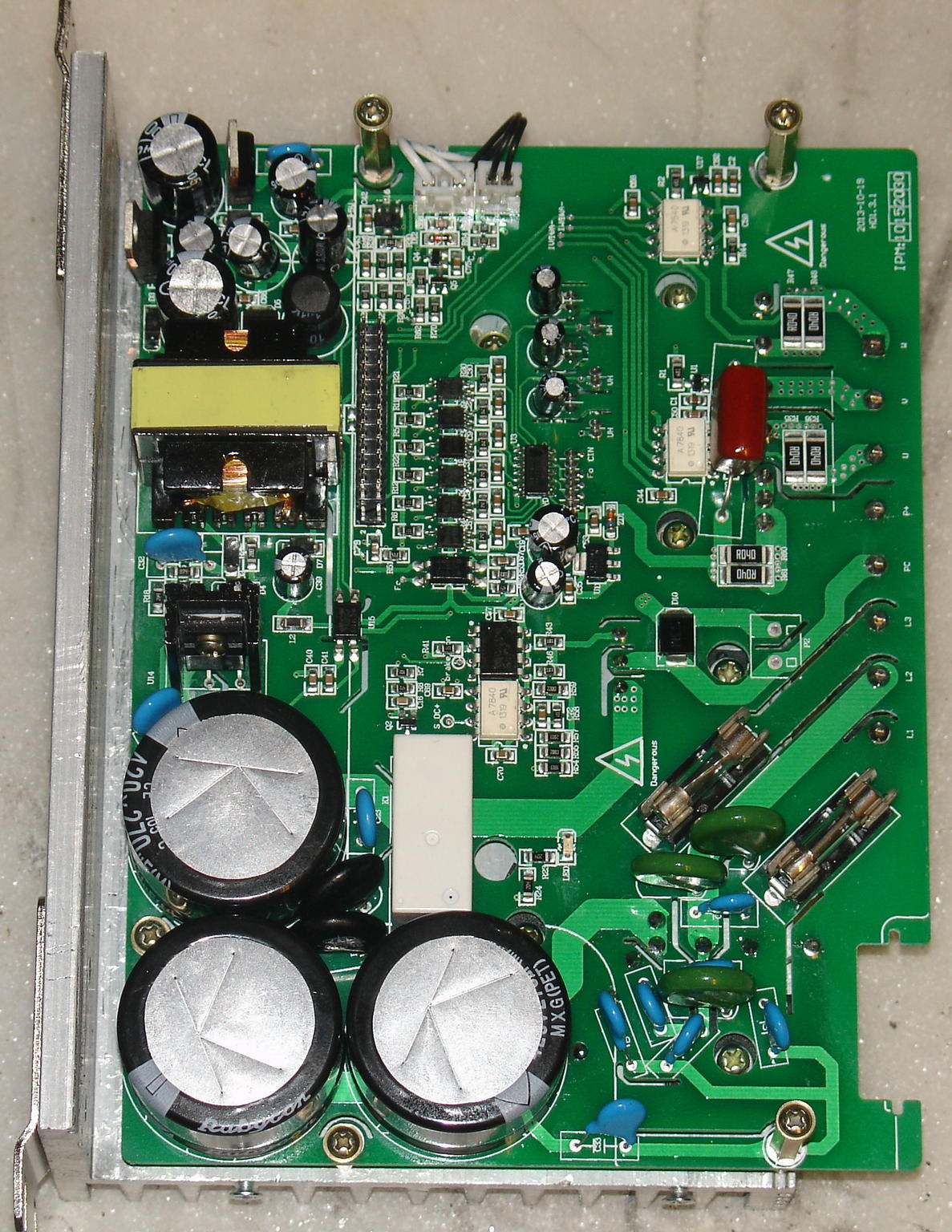 So this is the proper way to connect this drive in single phase 230VAC next is to measure DC bus for ripple on big electrolytic caps (with default 3 caps)