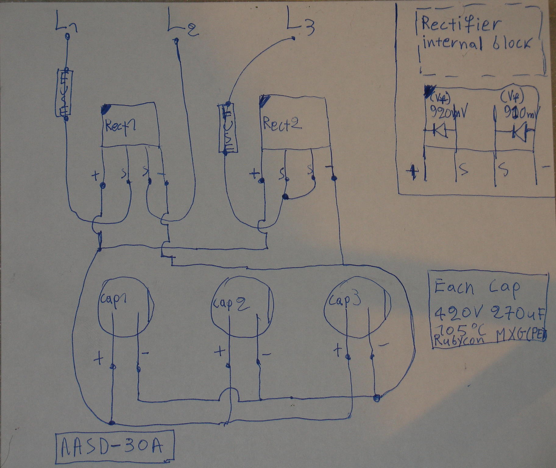 But, anyway I am pretty sure wiring the way I did (N, L, L) gives exactly the same work load to the caps and rectifiers as using 3 phase.