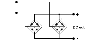 (In second rectifier the 2 ~ are allready bridged so you must bridge the 2 ~ of first rectifier to make all diodes to work with single phase 230VAC)