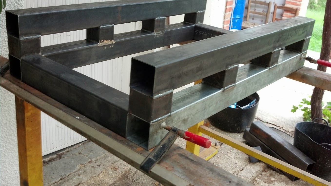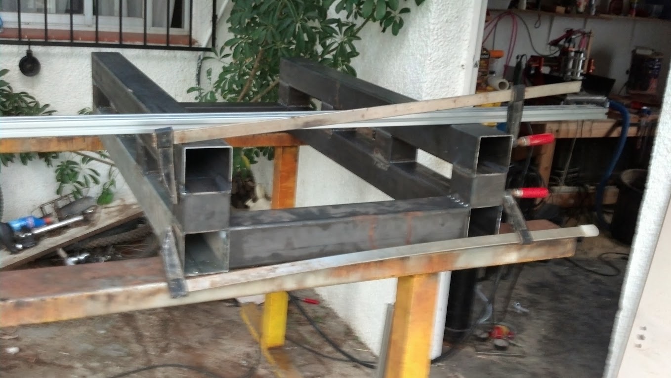 Ground the welds where the bed profiles go. Now the thing is that i have only 2 large clamps. I tightened slightly all from both sides on my new acquisition, the welding leg supports i acquired exchanging a vacuum pump for them. using a square and a plastic head hammer started playing around until i finished with square bed on one and the same plane.