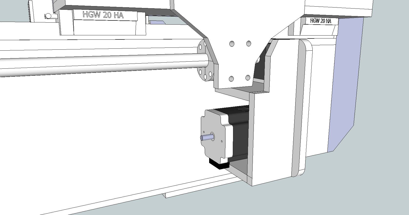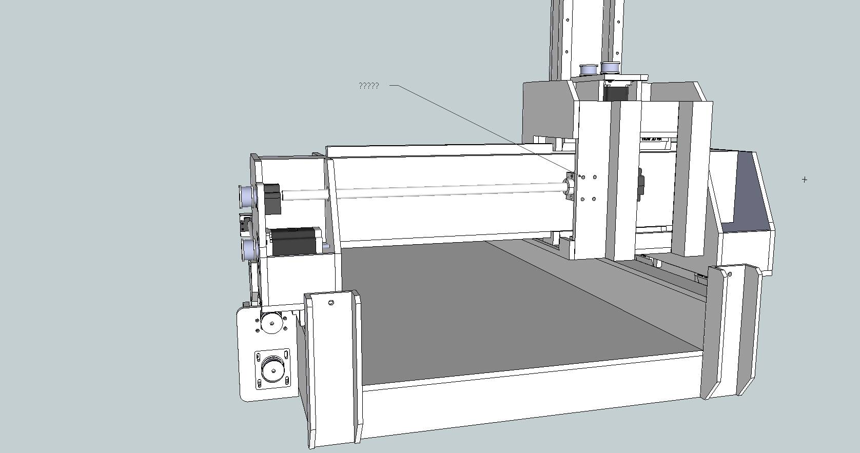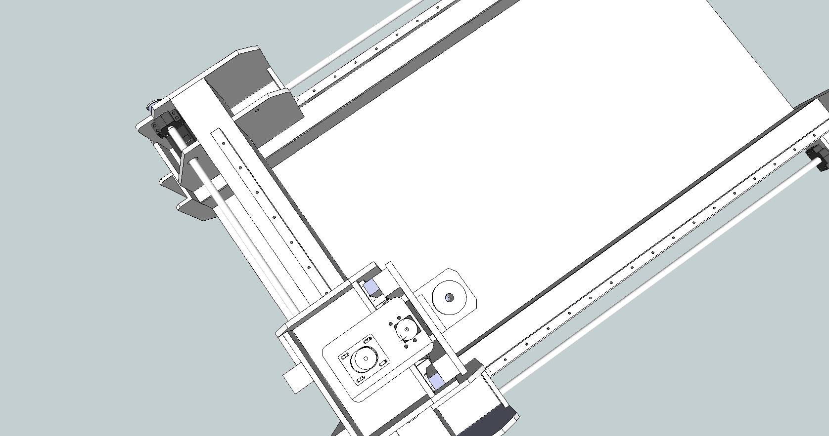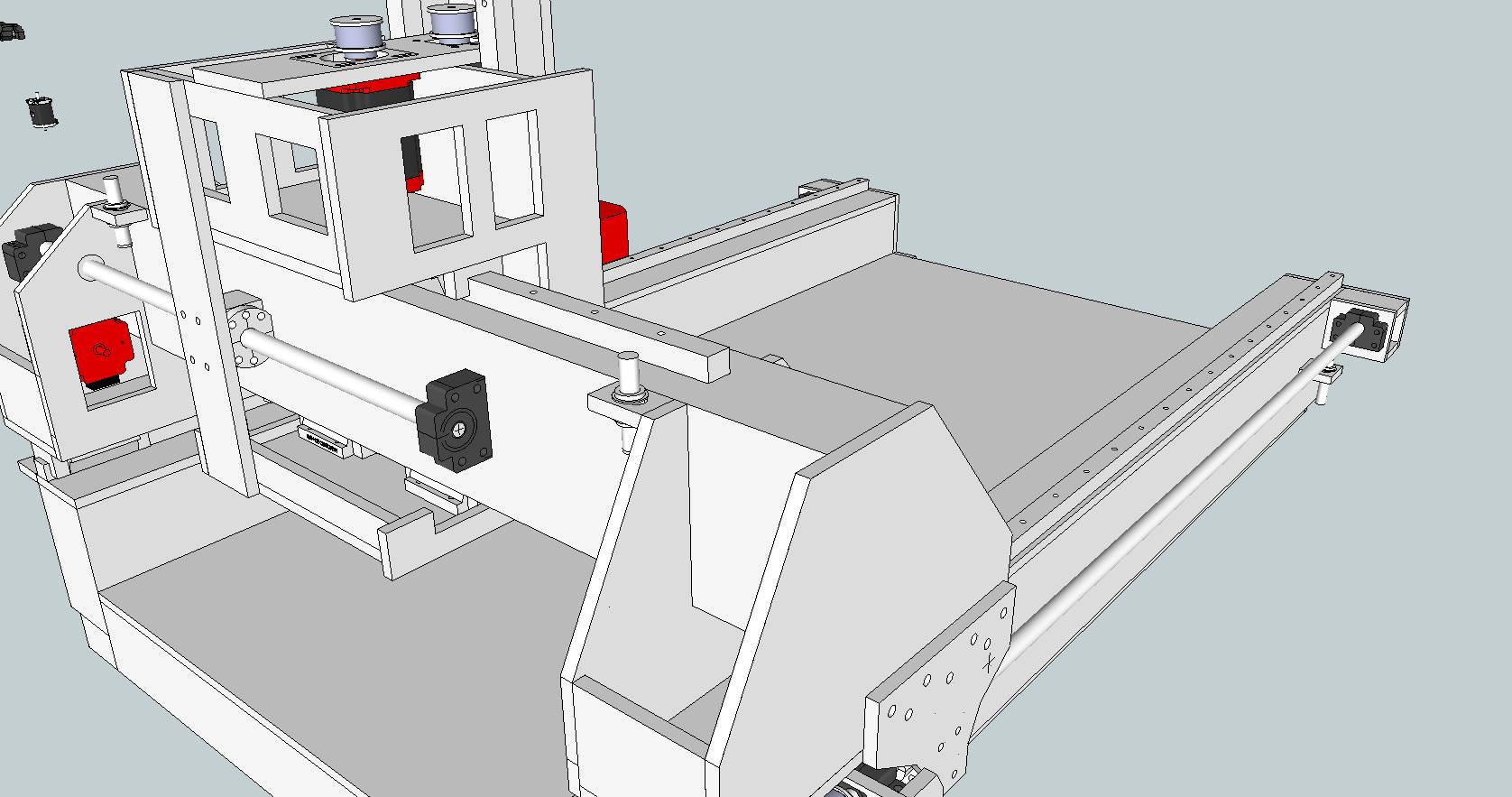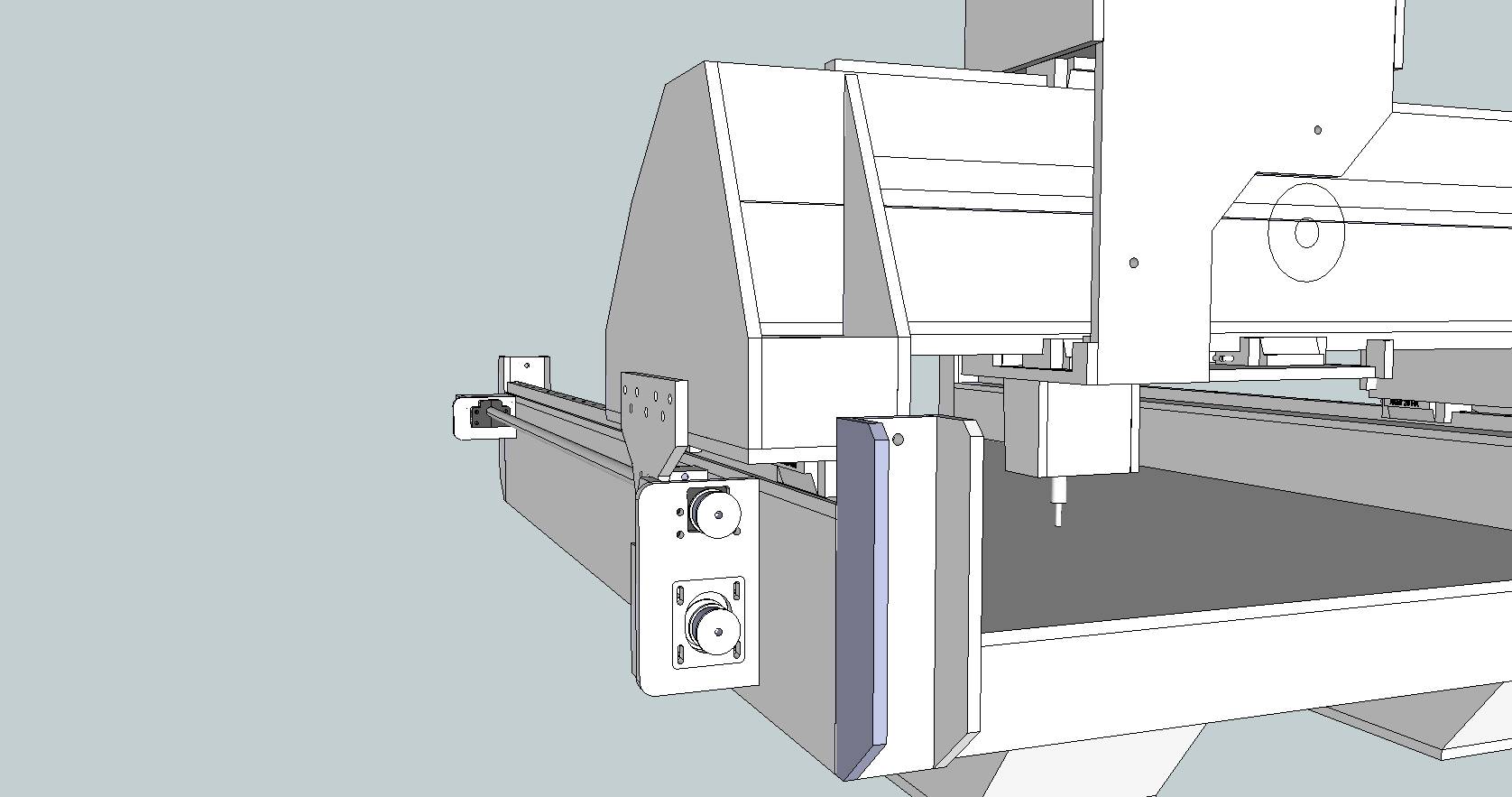I just realised the pics I posted were somewhat outdated. In the final version I moved the tabs holding rotating nuts/servos of X axis to the rear and turned them 180 degrees so the pulleys are just at the rear plane of gantry. This was done to make possible to add another pulleys so I can belt the two sides together with one long belt. There are schools of thought (especially on our local CNC forum) that they'd better be tied together so if one side will stall or not work properly the gantry won't damage the rails. I believe that this is not necessary as servos have quite reliable feedback and one stepper just wouldn't have enough torgue to damage rails and the other side will stall within few steps from the first side.
