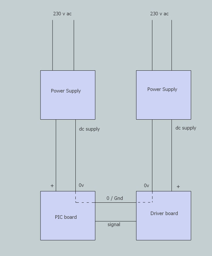 As I said before the PIC is powered from a plug-in 9VDC power supply, which is connected to the same 230VAC source as the 68VDC PSU which powers the motor / driver.