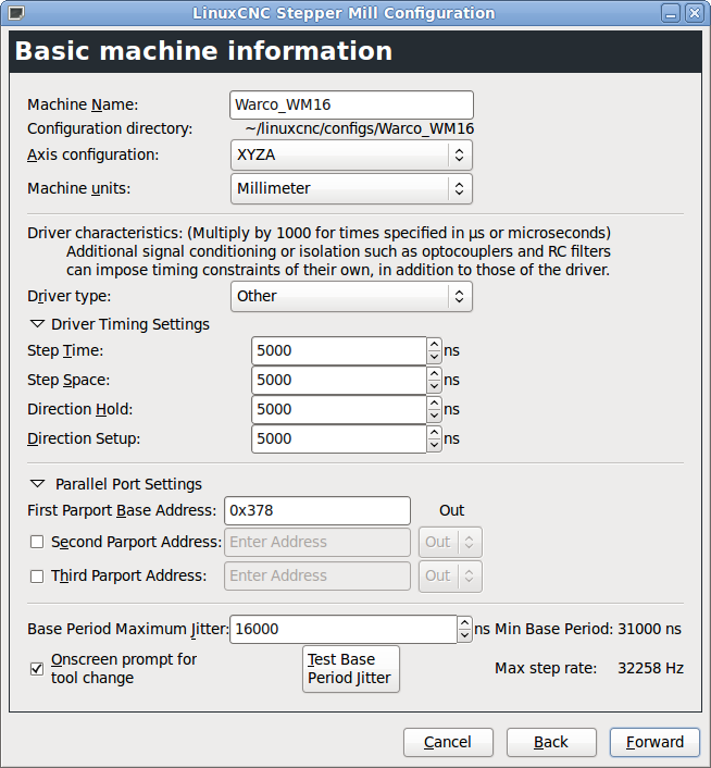 Thanks Jonathon. I would of gone for the 70V setup if I was buying again, but this 42V setup *should* be OK. I'm going to re-run the latency test as I have a wireless USB keyboard connected now (which I didn't have previously), so that may be causing issues. Attached are screenshots of my stepconf. Do these numbers look OK to you? I'm not sure about the timing settings of 5000 as I can't find any actual values in the drive manual. There are a few "542" type drives on this page, but they all have drastically different timings: LinuxCNC Documentation Wiki: Stepper Drive Timing. Again, I don't have enough info to get these set correctly... :disturbed: