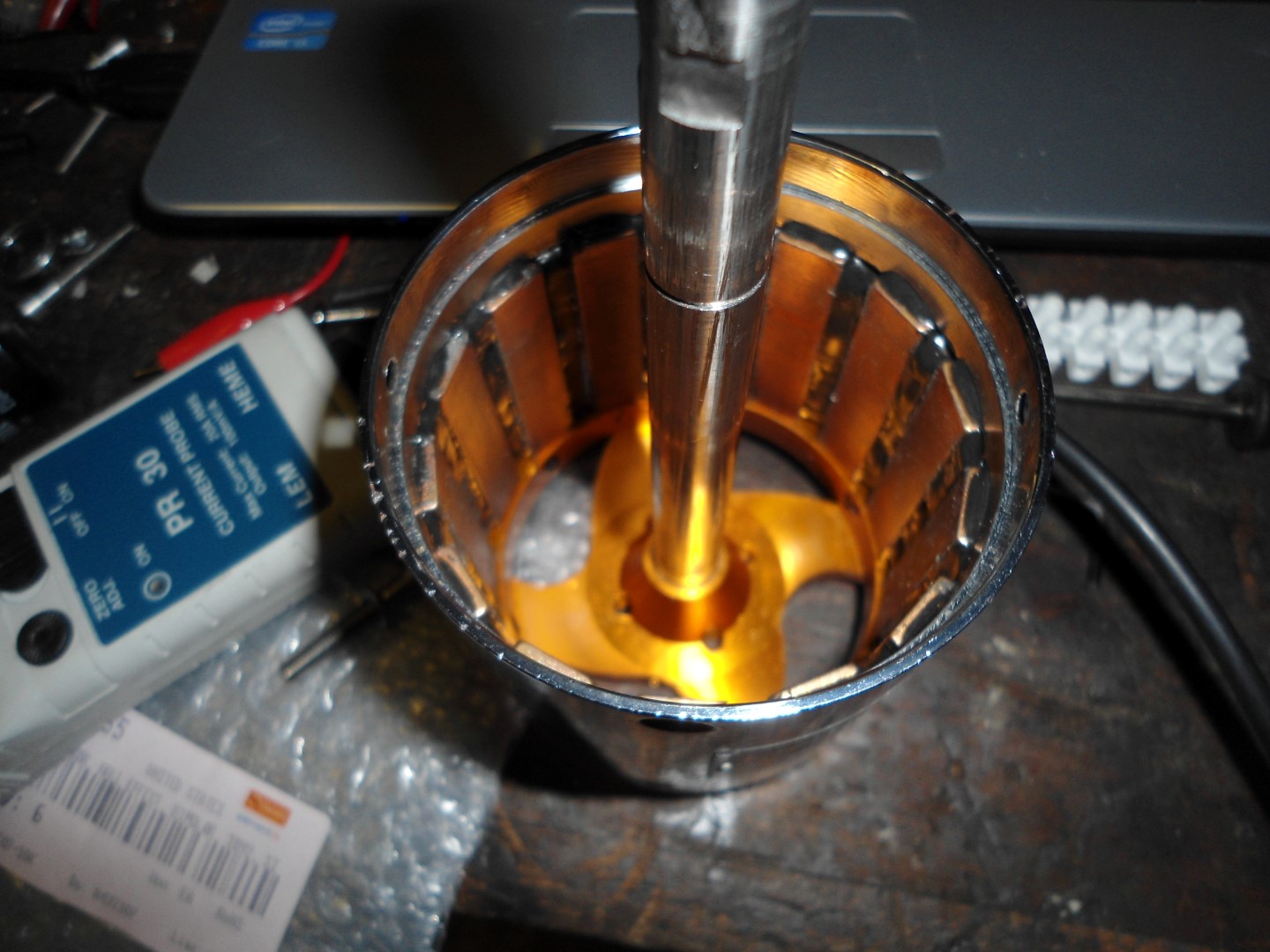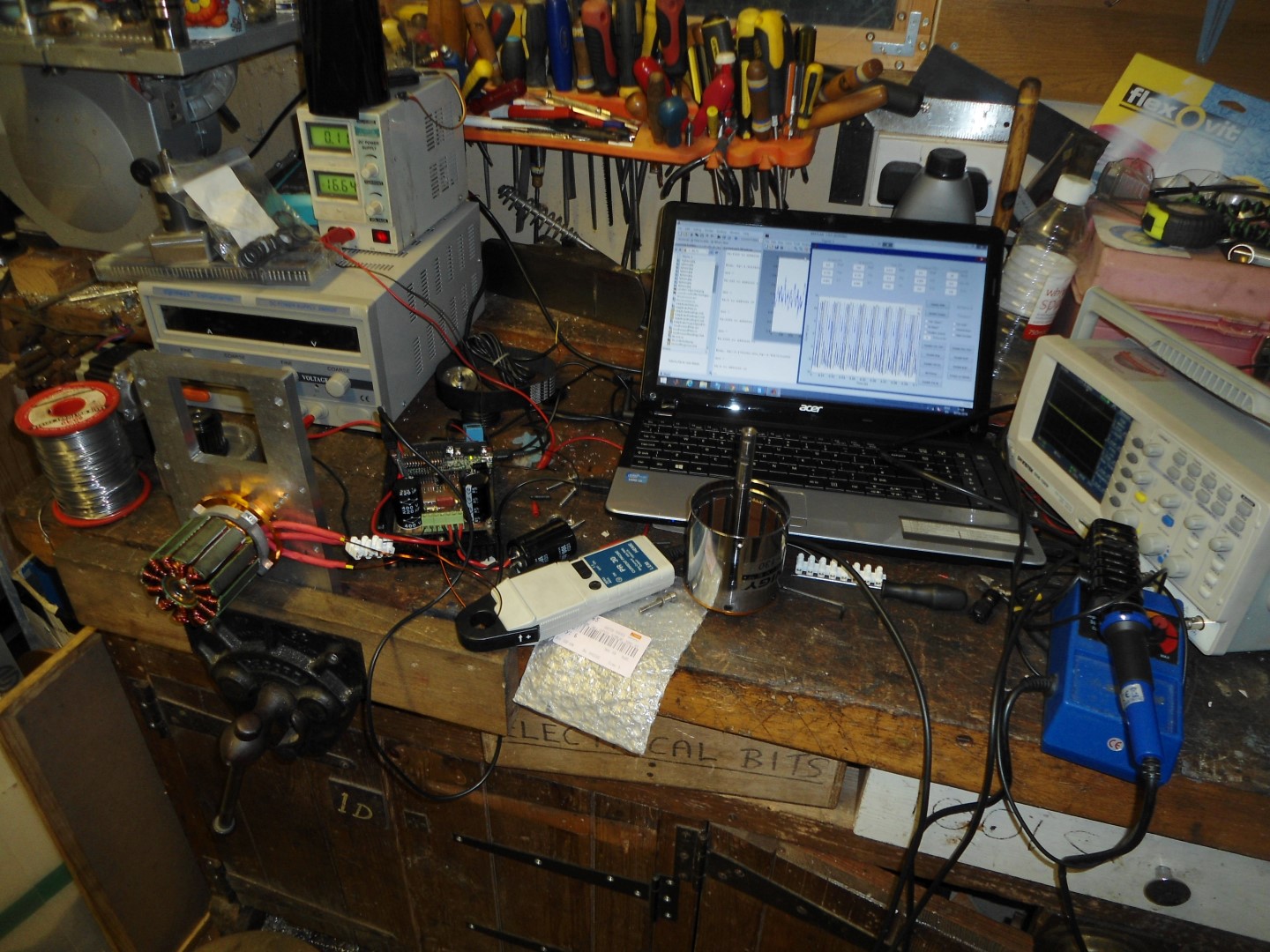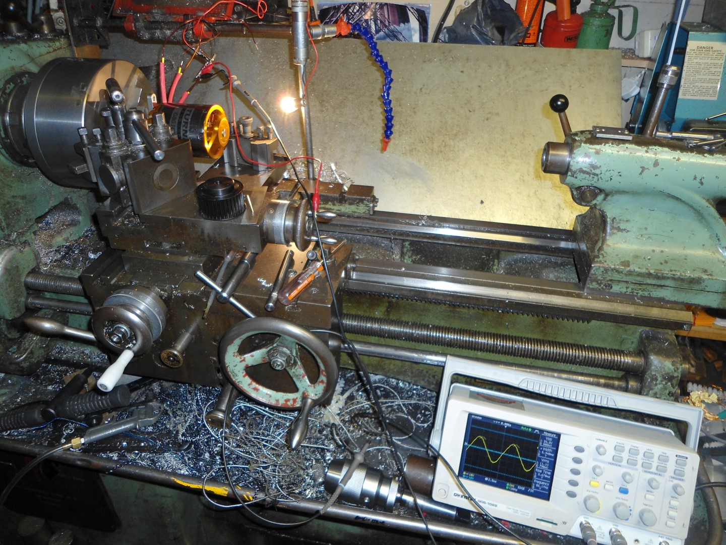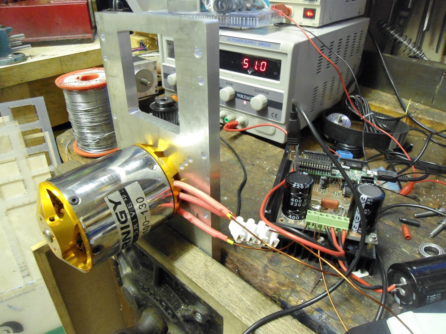Checked the back-emf constant was correct by spinning it in the lathe and measuring the peak voltage with oscilloscope. Then powered a small light bulb with it for general amusement...
