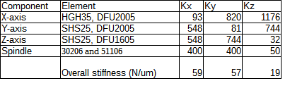 This implies that the stiffness is dominated by that of the ballscrews, as these are by far the smallest numbers in the table, so it is worthwhile to invest more in 'large' ballscrews as improving these should have the biggest effect on the overall stiffness of the axis. For the table above I've calculated the stiffness's based on DFU2005 on X and Y, with angular contact bearings on both ends of the X-ballscrew, to compensate for the lower stiffness of such a long ballscrew.