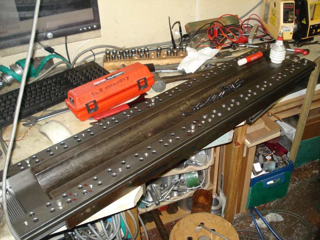 Next job is to drill and tap more holes than I care to count in the bed, which I can barely lift as it weighs more than me, so that's going to be fun... then I'll make the aluminium plates which fix on the steel strips that poke out of either end. Finally, I plan to get both sides of the bed surface ground so that the rails have a nice accurate surface to mount upon.