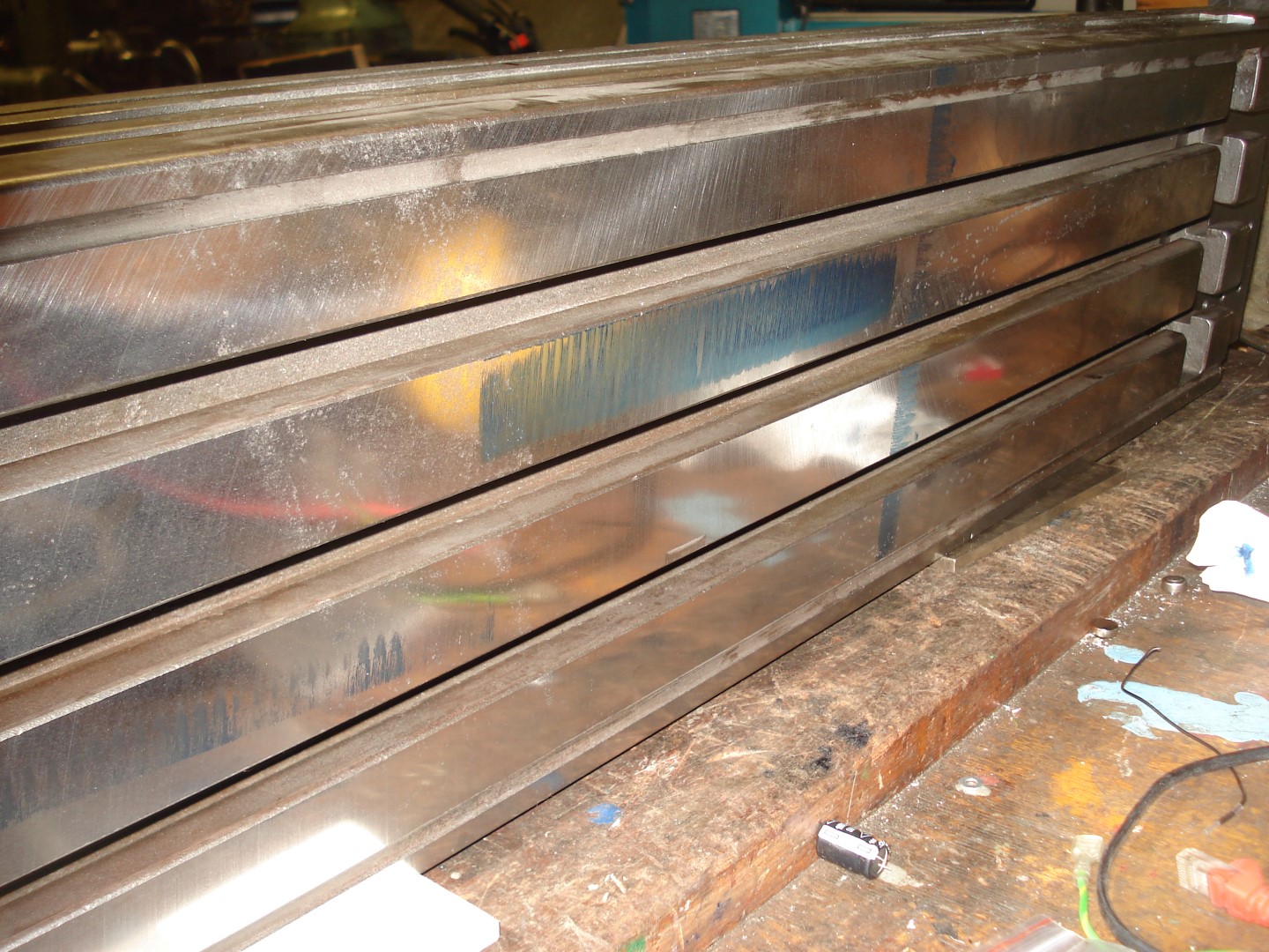 Flatness is harder to check - I've tried bluing a parallel and seeing how the blue transfers to the bed at places across the width and length. It seems fine, but the parallel is only about 200mm long. I do have a ~600mm long surface plate. No idea of it's history though so I'm not sure if there's much value in trying to check flatness with it?