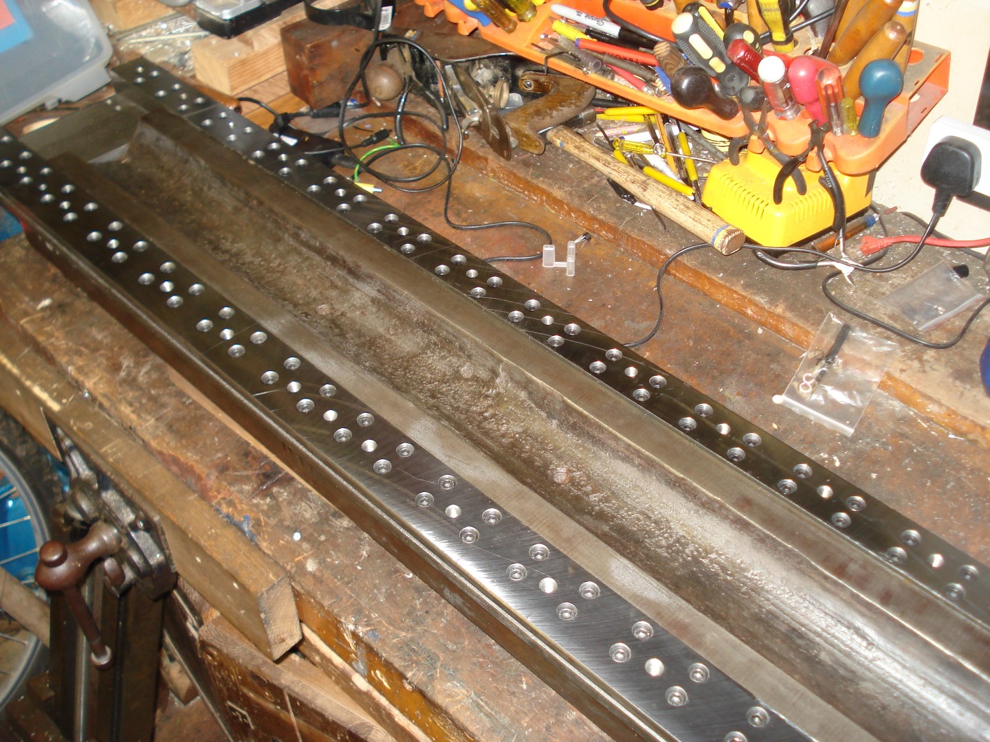 After another few hours drilling, I just managed not to capsize my milling machine, so now I've got all the holes in the bed:
