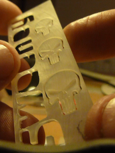 It went reasonably well, but after 16 hours of cutting (that's what you get for pocketing with a 0.2mm end-mill) the double-sided let go on the final cut-out pass. Managed to stop the machine before the cutter had a chance to ruin the work completely, but it meant having to re-align the stock manually to get myself an outer profile cut that was deep enough to manually grind back to (and under a bit) and maintain the illusion of a nice clean line. I did this with some level of success, but it's lop-sided and not good enough to pass as a usable piece.