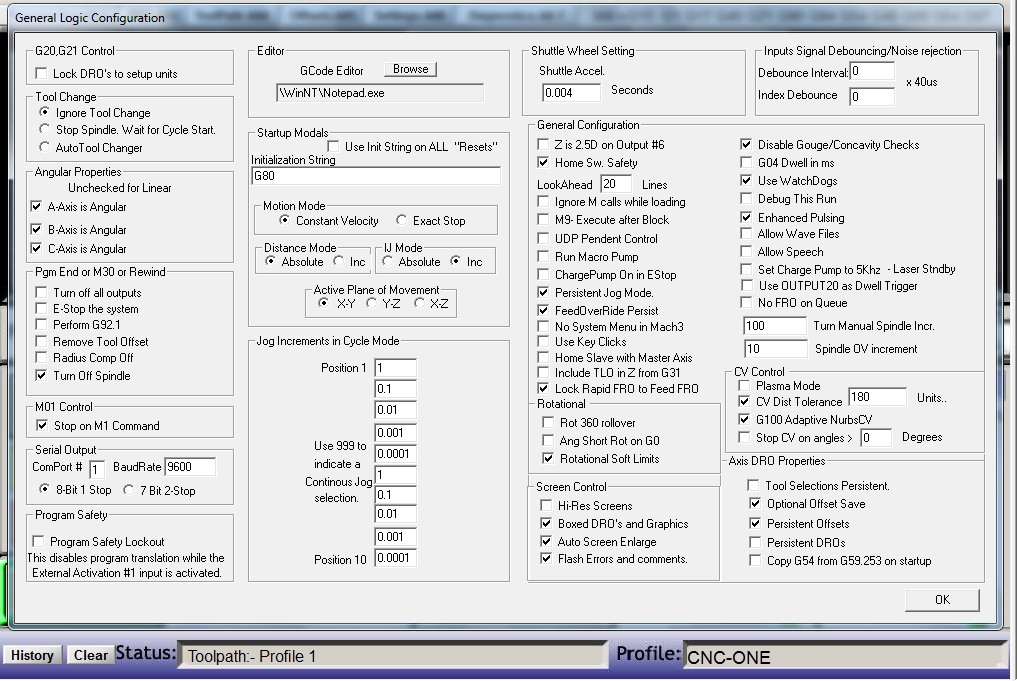 I have very little knowledge and have followed youtube videos thus far but I am at a point where I look to wisdom of the forum to hopefully guide me. I have mach 3 installed and the majority of my ports setup.I have no limit switches setup as I have run into some dreadful screeching noises when testing the roadrunner code. Im uncertain to what is making the noises I believe it might be a combination of the gears/cogs on the frameand the need of fine tuning the step motor settings. But when I use the jog button testing the axis the sound of stalling and screeching isn’t as loud or not present at all.