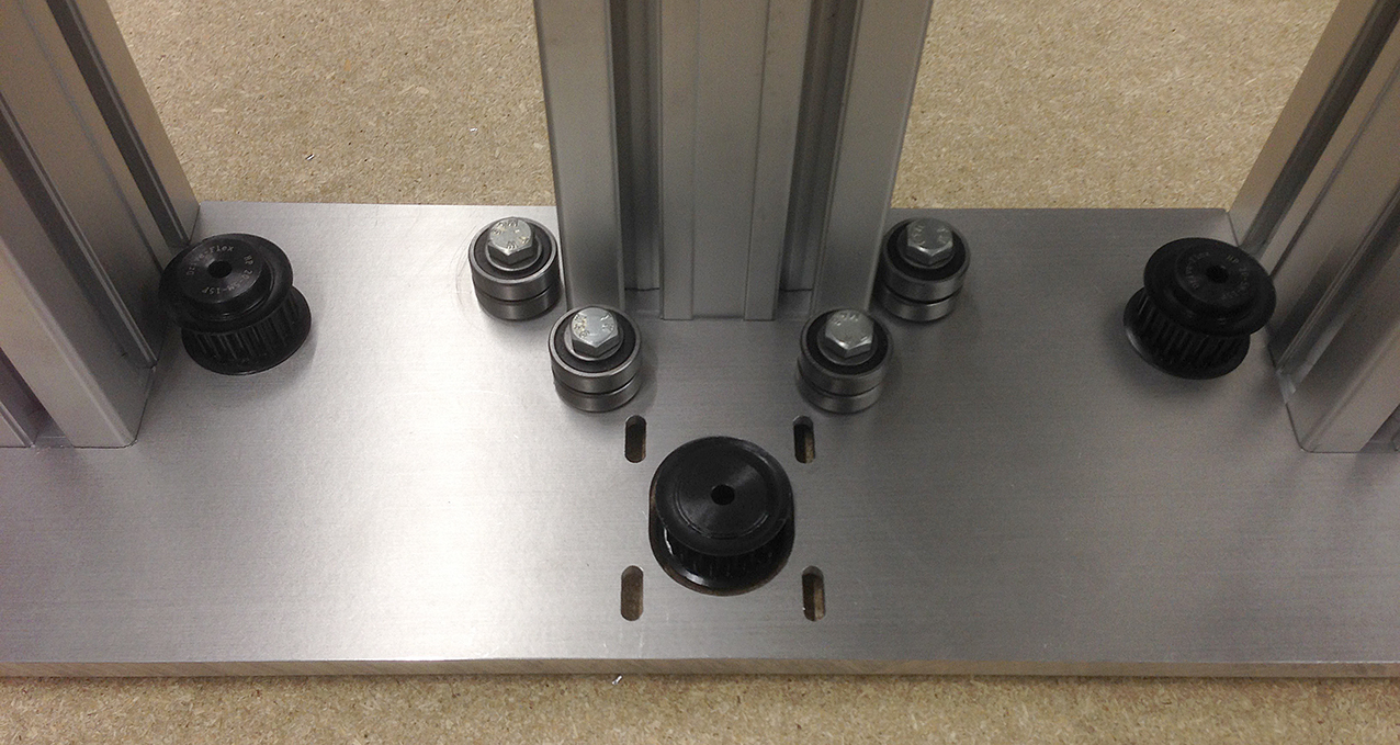 Inside of the front plate (maybe the back, not sure yet) idler bearings to shift the belt path...