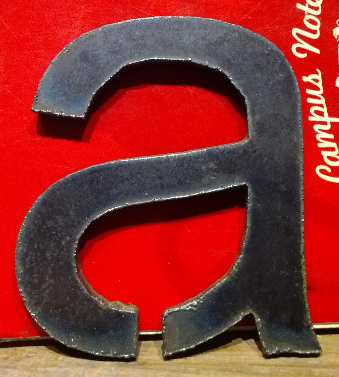 I'm cutting out the letter 'a' (arial font) in 3mm as test forms with my Thermal Dynamics plasma cutter. Letter size, approx 80mm x 50mm.
