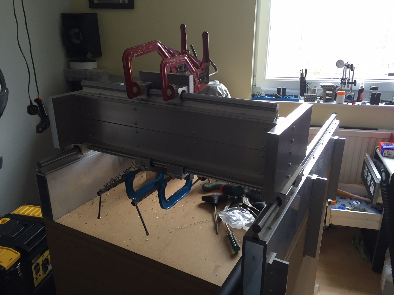 635x150x30mm 5083 Plate backed by two lengths of 3x1X1/4" angle which was drilled and plate drilled and tapped for M4, top and bottom trued, paralleled, drilled and tapped M4 again to mount rails.