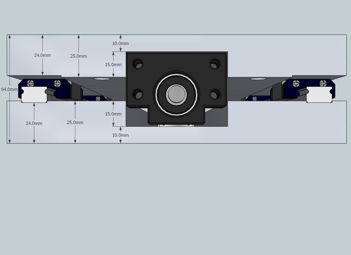 The Z axis I have uses 15mm NSK profiled rails and slides. The problem here is that the total height from the bottom of the rail to the top of the slide is 16mm. The ballscrew mounts which is in between the 2 plates is 43mm thick, so I have to add 30mm of material in between the plates. I would like to know is it best to have this extra spacer added to the rails side, or the slides side. Both variations are shown in the top drawings.