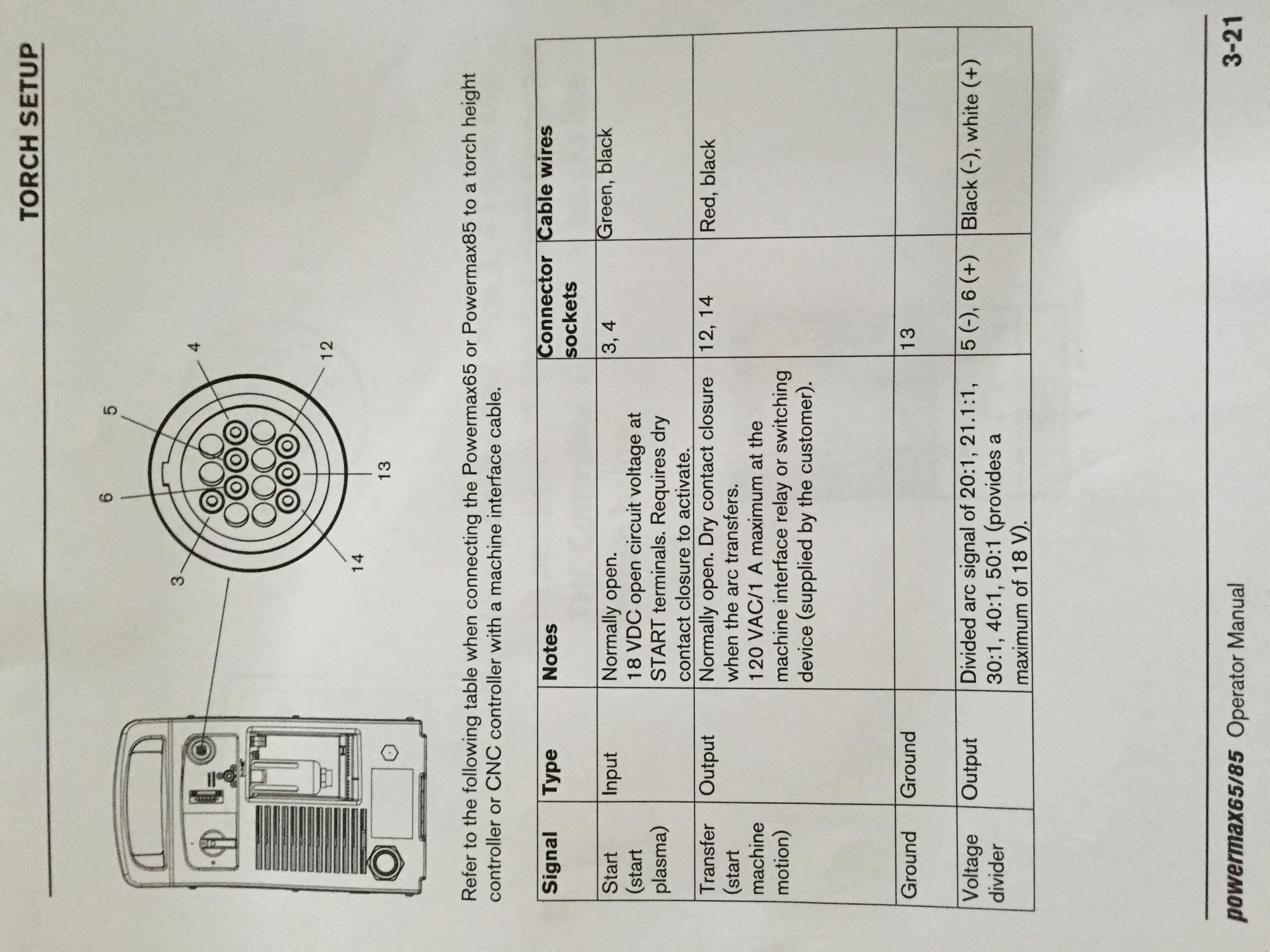 I have a Proma 150 THC and on the Directions says connect pin 5 and 6 to the controller. If you at the Hypertherm THC connection it says that pins 5 and 6 are black and white. If you use a continuity tester pin six is Green and pin 5 is black. Has anyone else come across this problem?