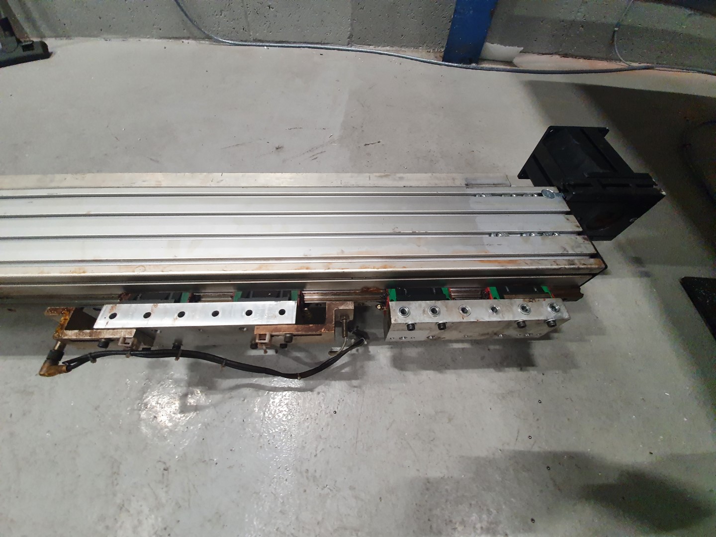 The main part of the robot was this 6m ali extrusion. Originally they have the half round guides with bearings on but the front one that takes all the weight of the robot tended to fail so we replaced those with linear bearings. I've cut these in half and I think, stood on end they will make a great base for the machine. I even went scrounging and found a spare pair of linear bearings that we saved off one of the other robots. This gives me two for each side which should make a pretty stable base for the gantry.
