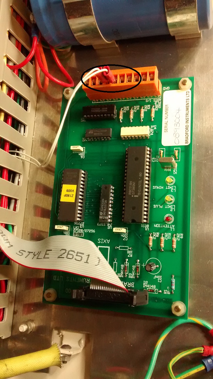 The Bradford instruments board is possibly also a limit switch interface, the ribbon cable is labelled PL1 fast serial link at its connection to the main processor board and contains very similar components to the main processor board. Comparing the photos of my machine (without a toolchanger) to yours I have a total of 5 wires and a loop on the orange connector, you only appear to have two. Where you have two white wires I have an orange and purple connected to CL5 and CL6 respectively on CONN1 on the stepper board. Suspect these are the clock and direction for one axis.