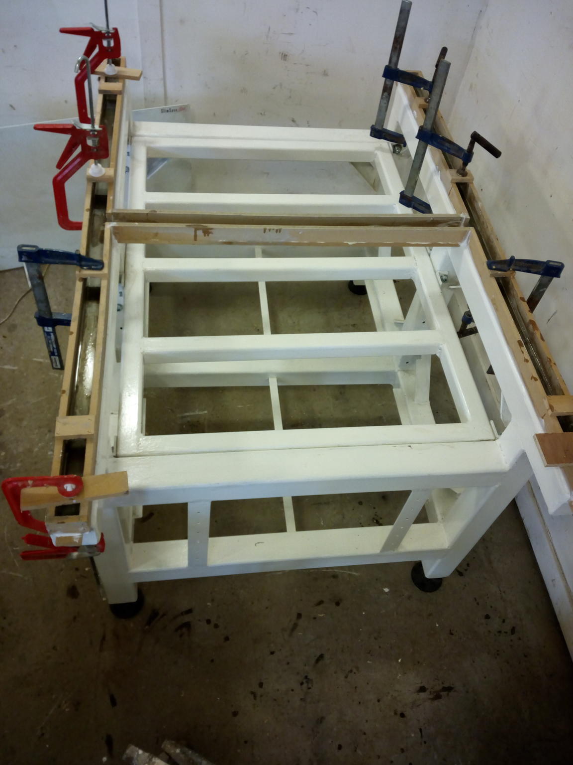 So just poured the epoxy (West System 105-209) no leaks - so far. MDF frame nail gunned and coated with two coats of sealer so hope it will come away neatly. Then mastic and clamped in place. 40mm wide and 30mm wide bridge, should give thickness of 5mm from 1Kg of 105. My wood drying kiln is on at the moment in the workshop providing some of the heat. It runs at 30 degrees and leaks out into the workshop. The rest of the heat provided by electric radiator and fan heaters. Started pouring at 16 degrees and its going up.