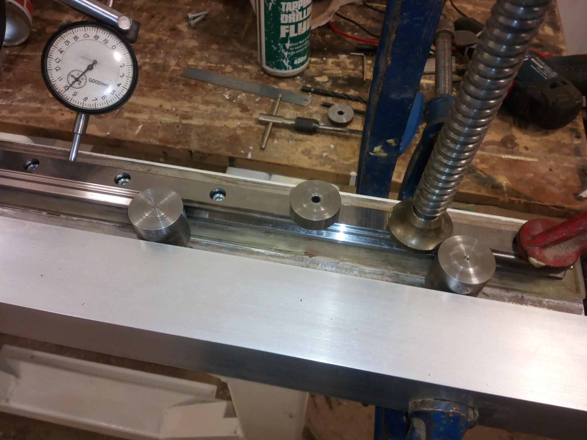 So just finished fixing the x rails onto the resin bed, 3 weeks after pouring. Many ways to fix the rails I read on the forum. I went for a straight edge (Probably not) ally 50mm box section. Clamped to side of bed then spaced 30mm to side of rail using lengths of 30mm diameter bar. This positions rail in centre of 80mm box section (30mm + 20mm rail +30mm =80mm) Clamped rail, drilled and taped each hole then moved along a hole at a time. Second rail repeat process and checked and adjusted gantry, to make sure smooth running and no nasty noises. Checked with DTI.