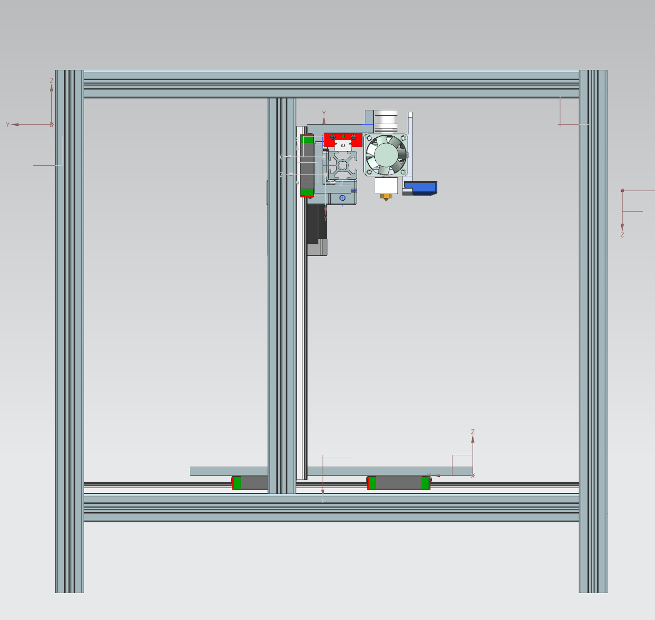 Anyway, i moved further with the design. Managed to make the gantry very tight vertically, same with the hotend. Plus at the end i decided how what to do with the X motor, which will go in the clearance between the gantry sides and the table, which means keeping the structure height etremely low. That combined with the shallow depth will make it a real table top machine. Not some ugly cube. At the moment stands wide 620mm and high 370mm. I am still playing with the idea if i need or not the top and bottom cross bars, look last picture where removed. Looks more simple and better to the eye, I will decide that later . Their main idea was so if i sell the machine to sb all linear elements to be premounted here by me, Guess i have to receive the 20x20 profile and see how it will go. Their other function is if you fit servo drives and do crazy speeds so the machine to wobble. Though it wouldn't if side and top panels are fitted