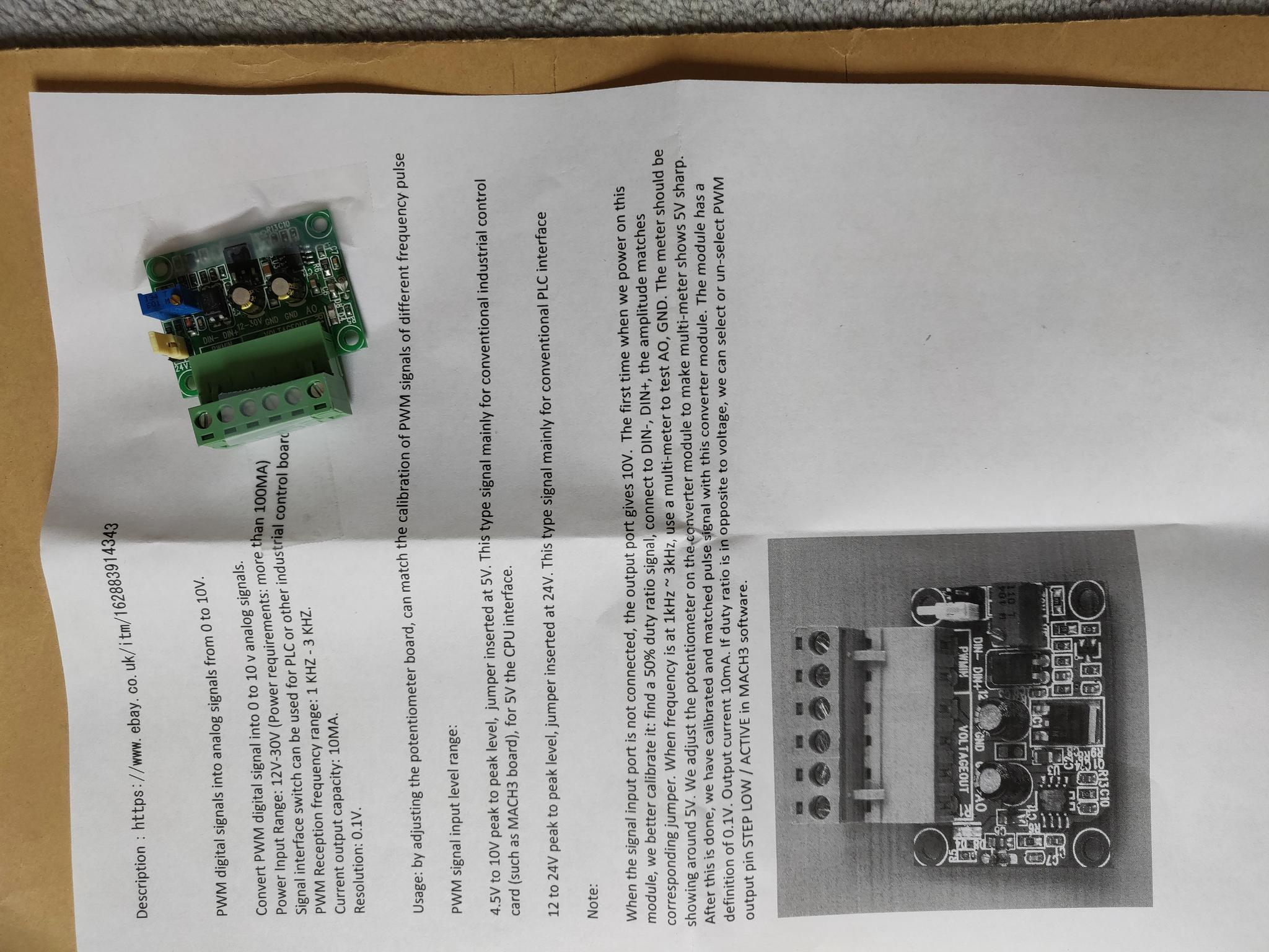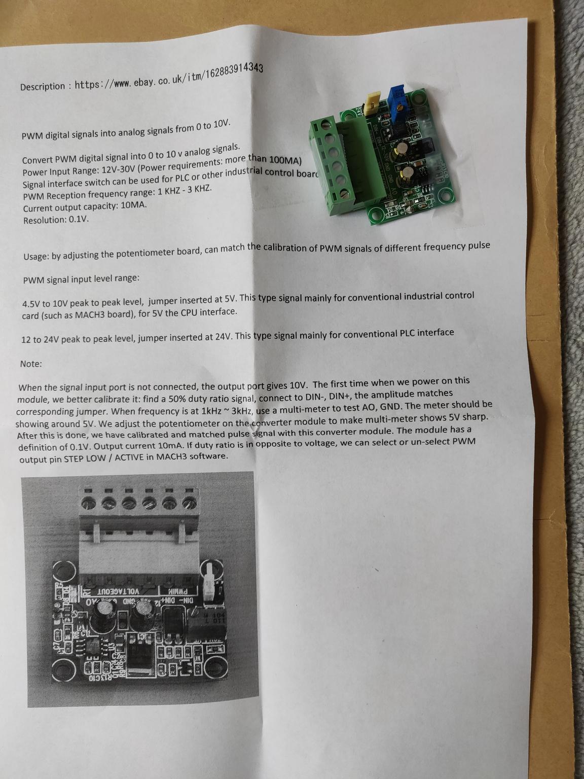 17-01-2019 #25Not sure what you mean here, would you mind elaborating please.. I used the pwm signal from my bob and the https://www.ebay.co.uk/itm/111654184682 to convert it to 0-10V isolated for the spindle driver board.I think the RMHV is essentially the same as the DDCSV, and I don't think there is an option to use step/dir for spindle control. And I don't think the 0-10V is isolated. The only way you could get it to work with a non-isolated drive would be with a 0-10V to 0-10V isolator..Clive