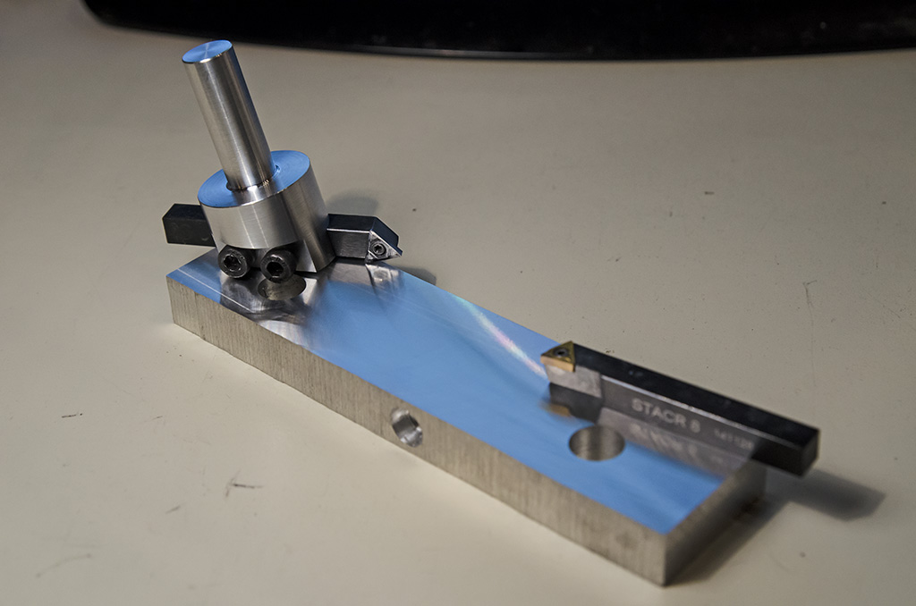 In other news, I decided to make a small fly cutter, I wanted to see if it could be usable in that spindle. I had some 7075 bar (don't freak out, it's just a proof of concept), so I turned a 12mm shaft with a 30mm body and a 8mm slot on a 10 degree angle to mount a turning tool with a polished carbide insert in. Now, I would swear I had a 95 degree left hand tool somewhere, turns out it was right hand... The one pictured on the fly cutter is the only thing I had that would mount and make a cut, even though it's the wrong tool to use.