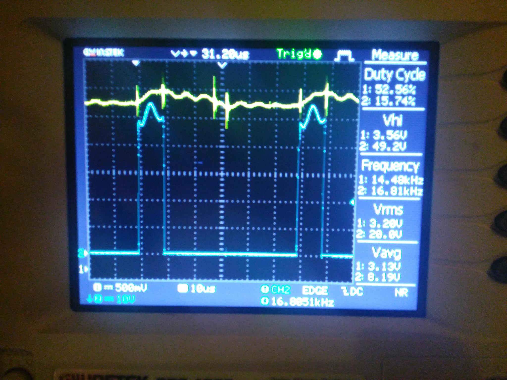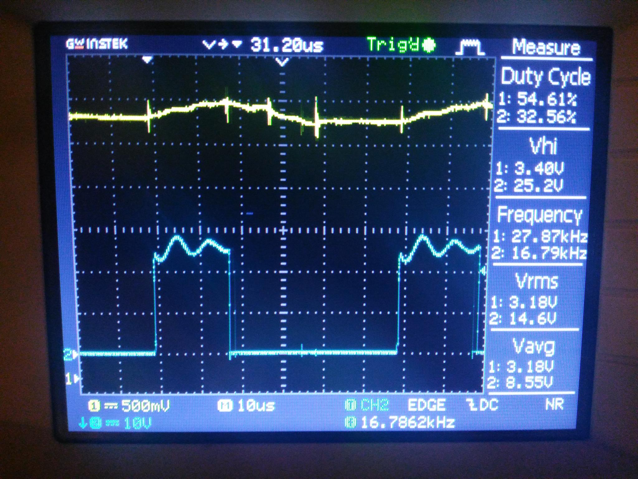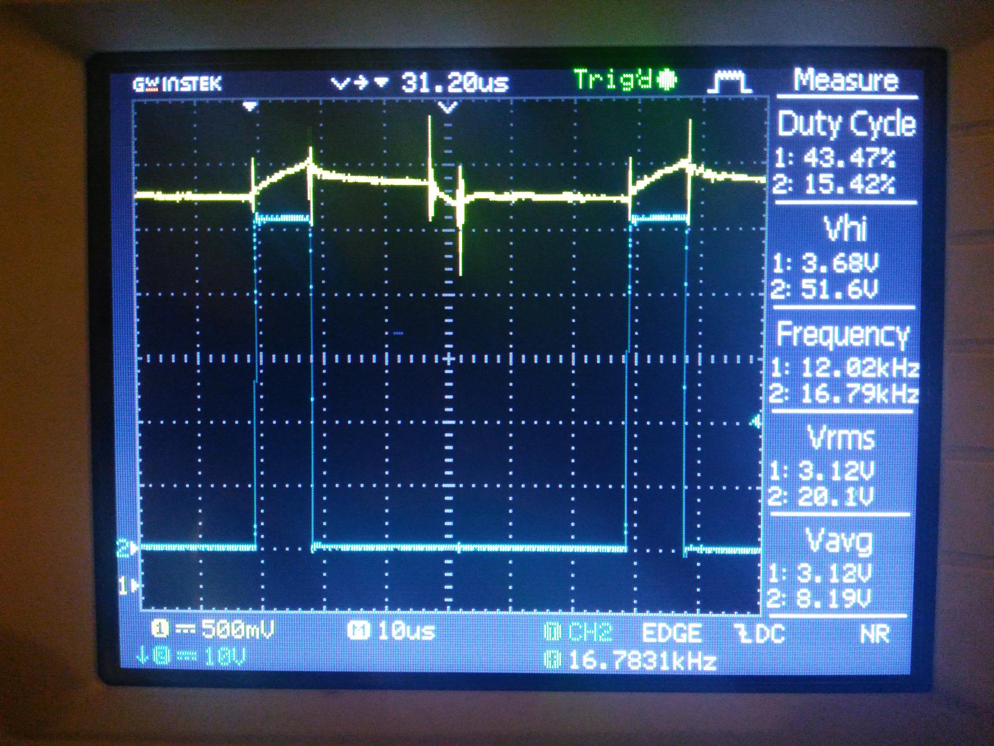 Same again, but with a lower supply voltage - notice the current is the same (so the regulation is working) and the duty cycle has increased.
