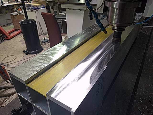 Gantry being milled. We ended up at about 0.02 mm flatness over 1450 mm