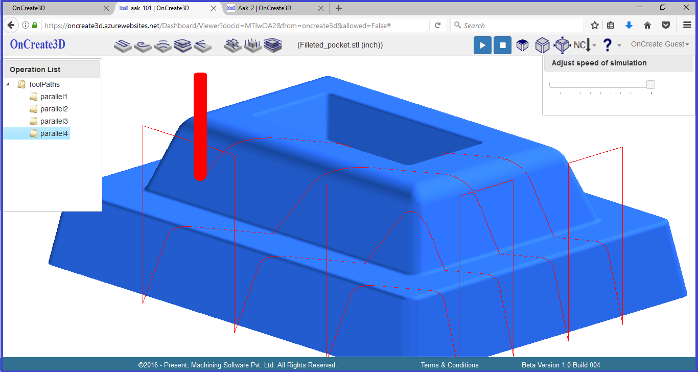 OnCreate3D has introduced toolpath simulation to visually check for correctness of toolpaths before downloading NC Files. You can play/Pause any time, you can speed up/down anytime. Although it is simple simulation for time being, we are working on showing updated stock after every operation. The feature is coming soon. Stay tuned.