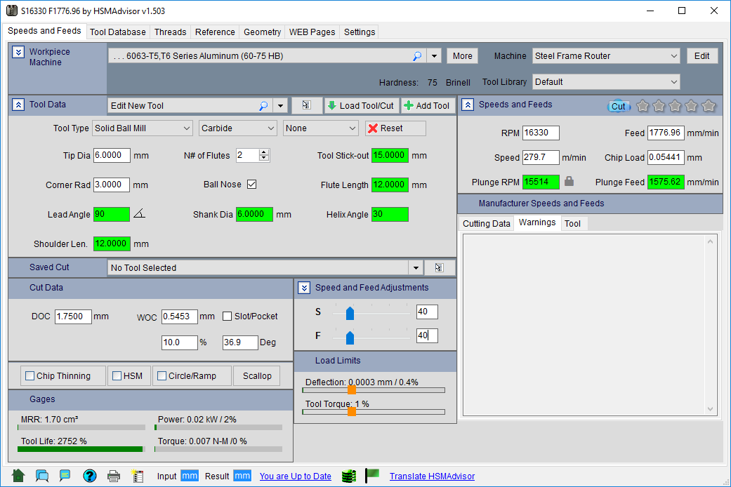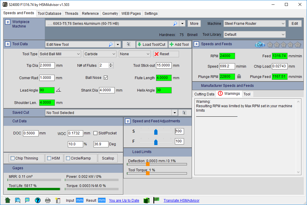 - So firstly, am I right in thinking that HSM outputs the extreme limits and as long as I adjust spindle speed and feed rate proportionally I will be OK no matter how high or low (as long as within machines limits)?