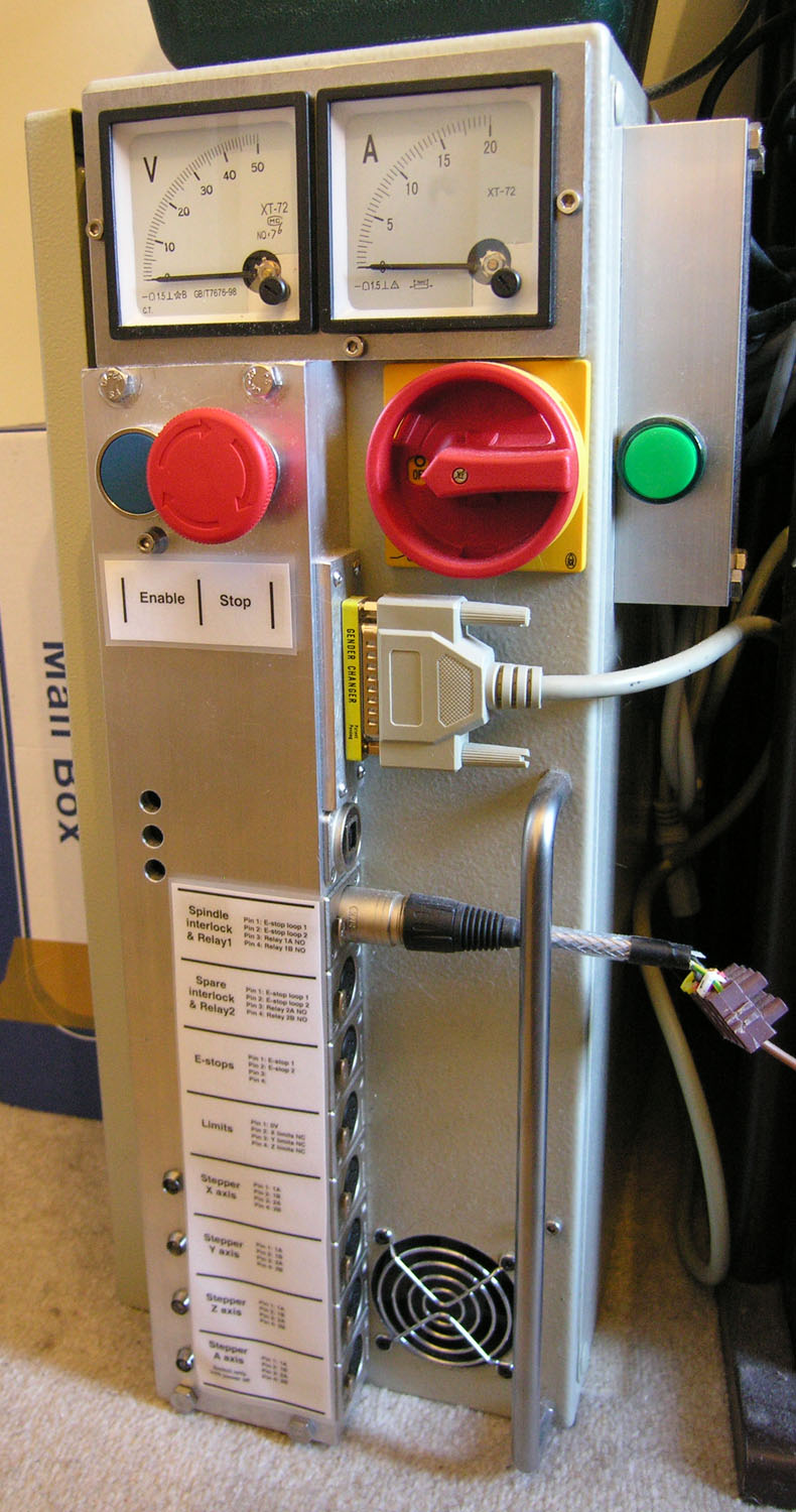 Did manage to get the control box finished and tested - see attachment - went a bit OTT with blinkenlights and meters but I like it :-). Don't like sticking out cables so put on the alu channel for the XLR sockets. The other bit of channel on the right hand side is where the mains comes in from the back (and there are also two mains outlets for spindle power etc which are also controlled by the main isolator switch). Did an OTT e-stop scheme with time delay relays, links out to e-stop a future spindle VFD, etc etc. Will do a proper write up at some point...
