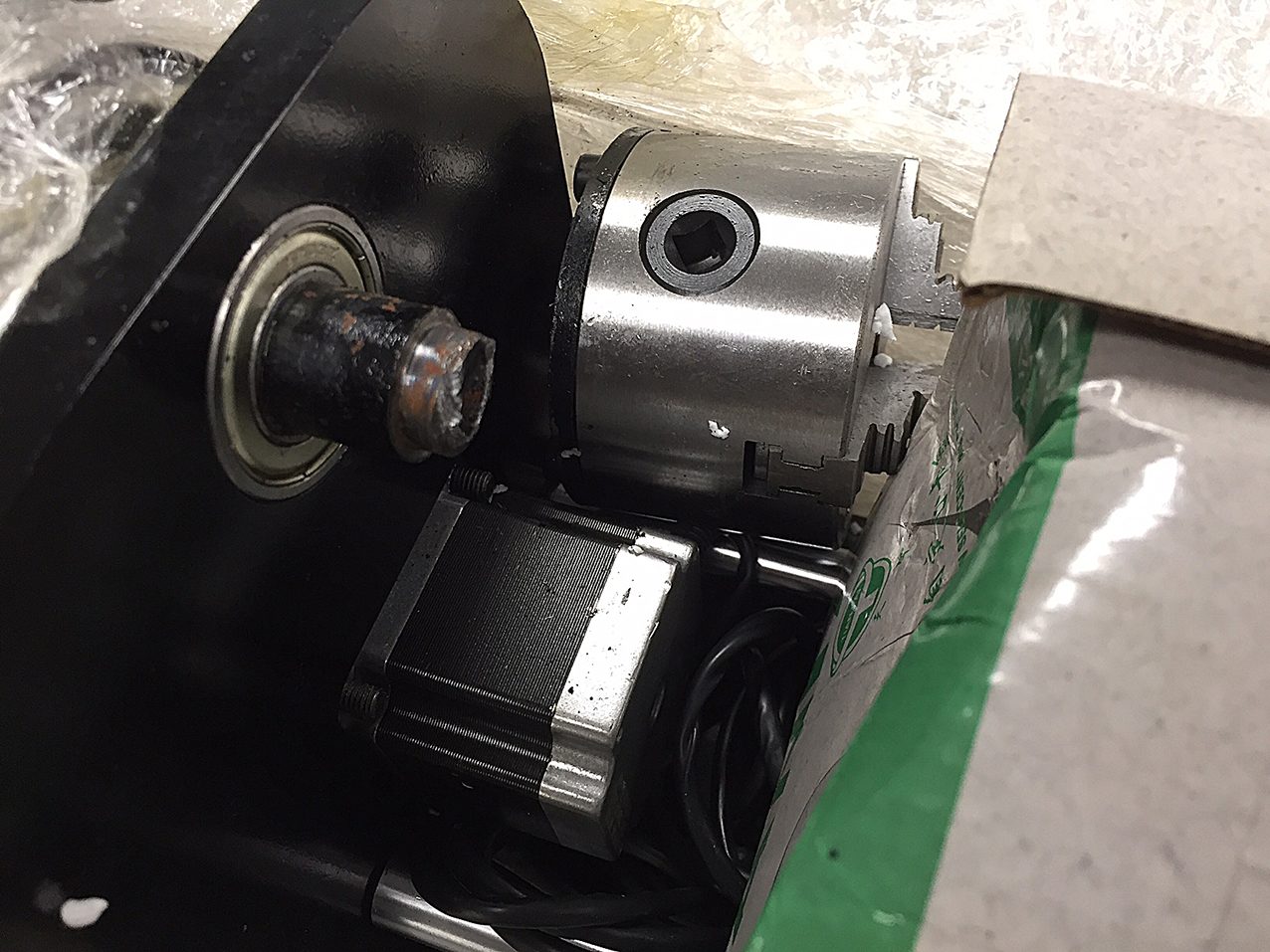 My rotary attachment is still bubble wrapped but mine is the simpler, cheaper unit with no chuck, just a set of stepper driven 3 rollers to hold a glass or bottle by friction.