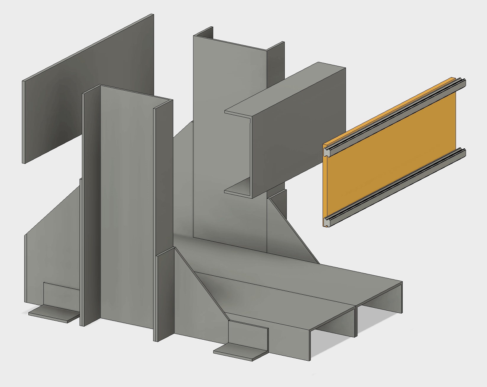 The orange plates are 10 or 12mm ground steel gauge plate & the white parts Aluminium tooling plate. The red indicates the cutting area.