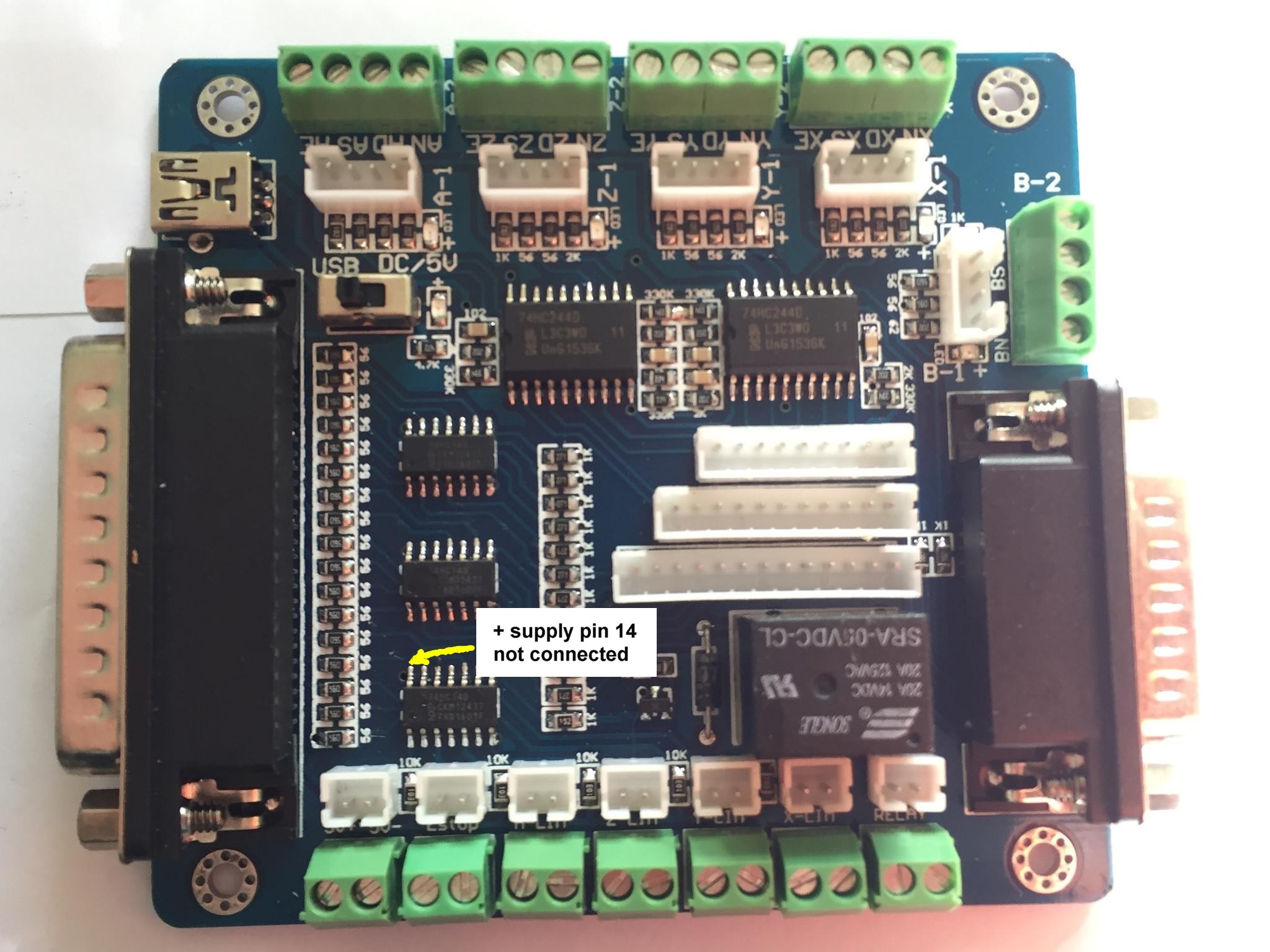 it turns out that the 74hc14 IC used to buffer the inputs doesn't have the supply pin connected !!!!