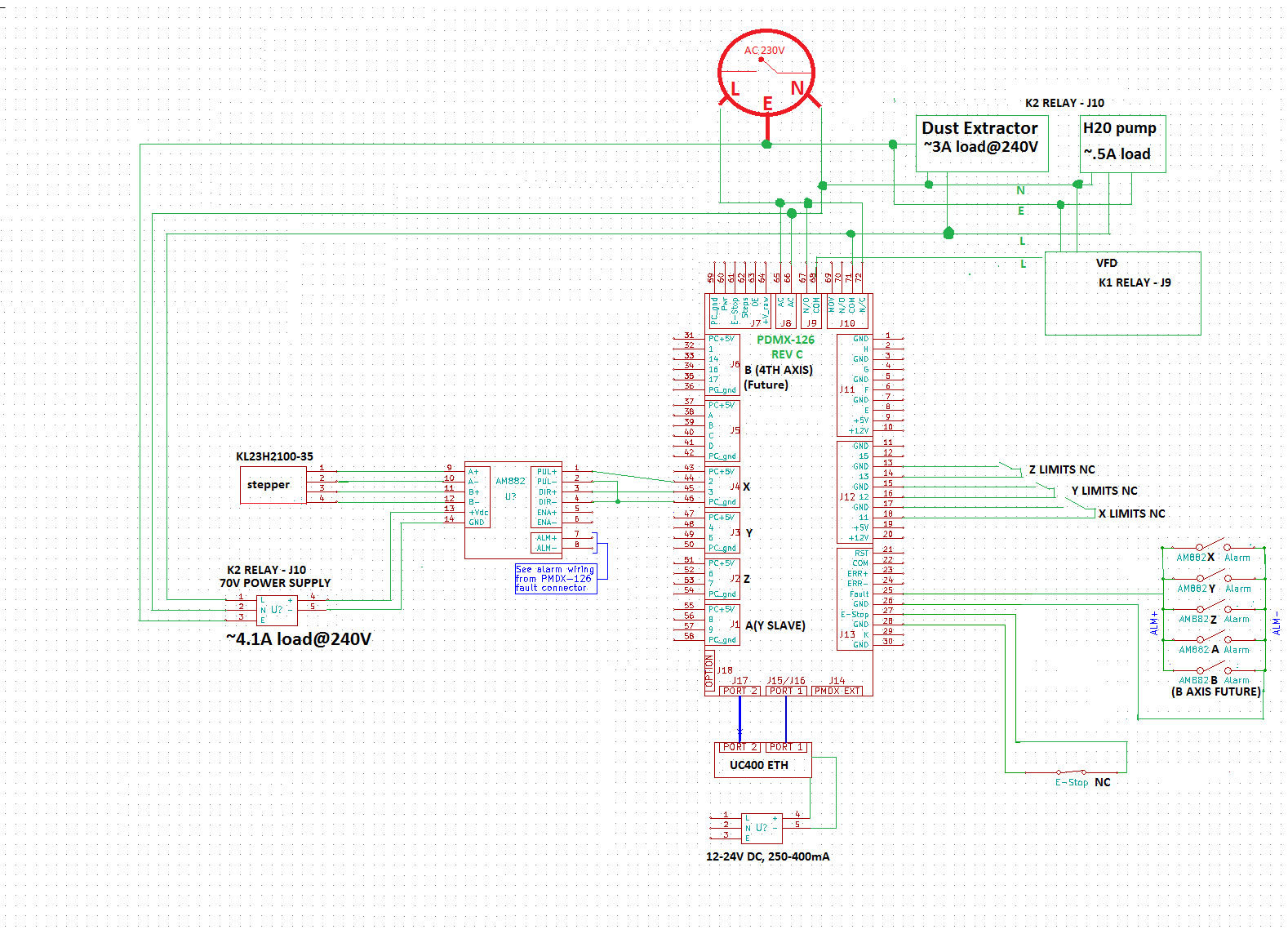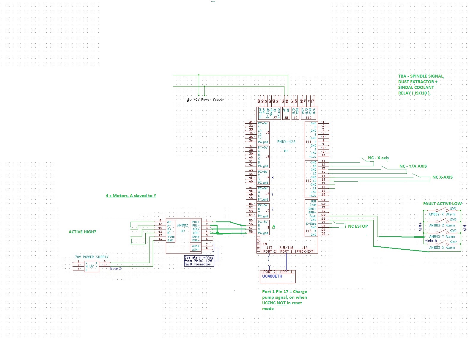 The AM882 schematic has all the PIL'DIR/ENA/ALM -, all connected together, then all going to earth - but on the PDMX I have earths in the J13 ( e-stop area ) and I also have individual PC GNDfor each of the driver setp/dir signals, so I figured that the DIR/SteP- should go together to their respective VCC GND, and the ALM- with be seriesed and then run to a GND in the Fault area ( J13 )