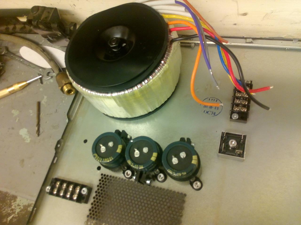 Before you connect the caps up measure the voltage on the secondary side of the transformer (it should be around 50v AC) With the caps connected DC side it should be about 70v dc (DON'T TOUCH THE CAPS WHEN THEY ARE CHARGED as they will bite you) without a load on they will stay charged for a long time.Last edited by Clive S; 15-09-2017 at 05:07 PM.