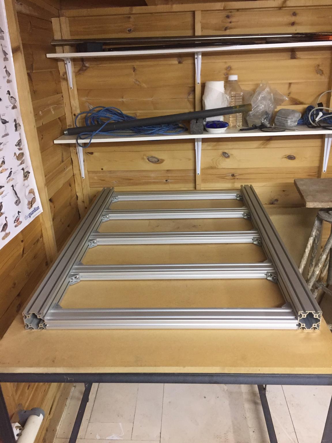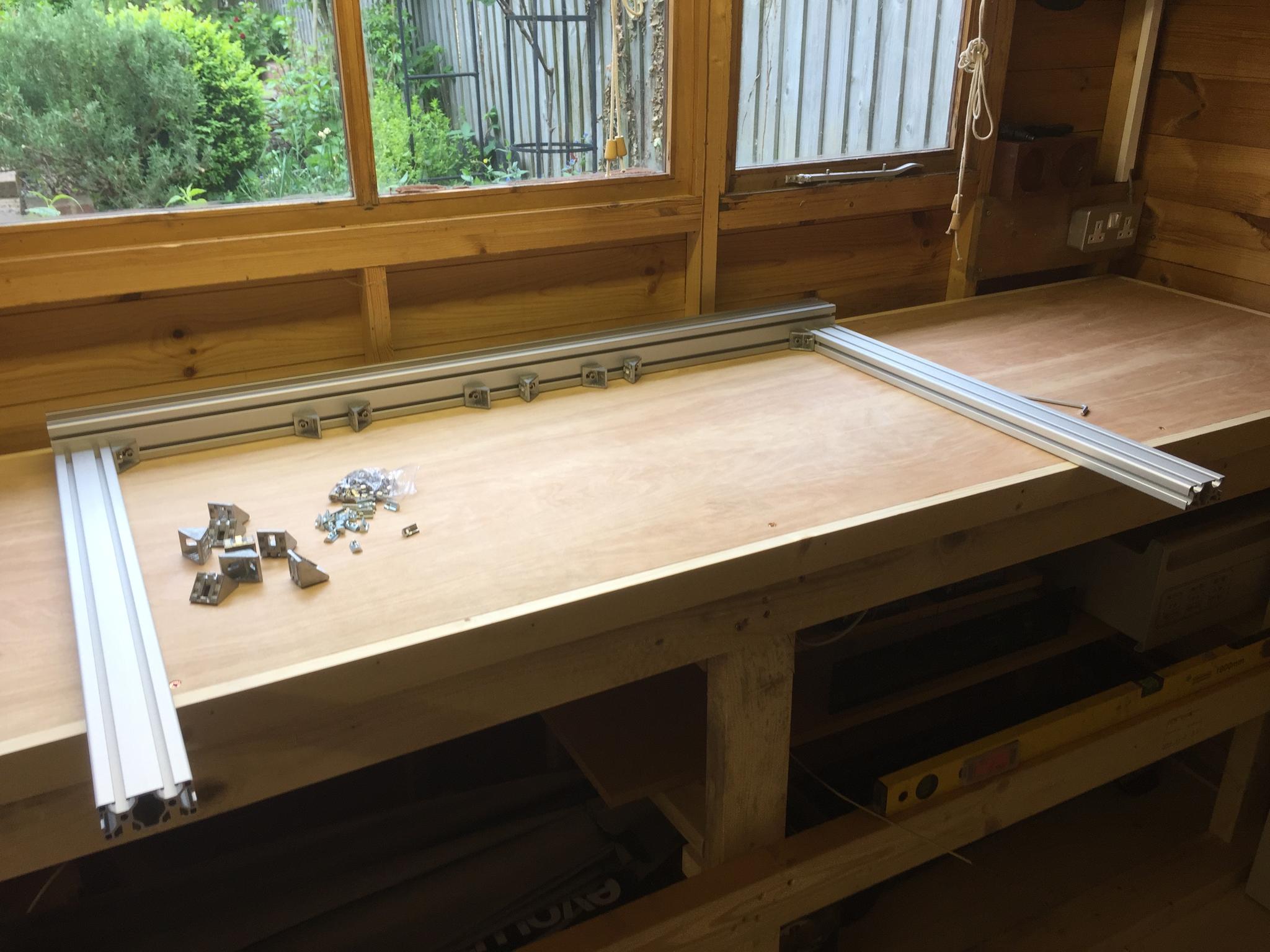 A bit of space to spread out in the shed. Ally profile supplied and cut to specified size from KJN in Leicestershire. Two 60 x 60 profiles to support the supported rails and Five 30 x 60 profiles as cross beams to create the base.