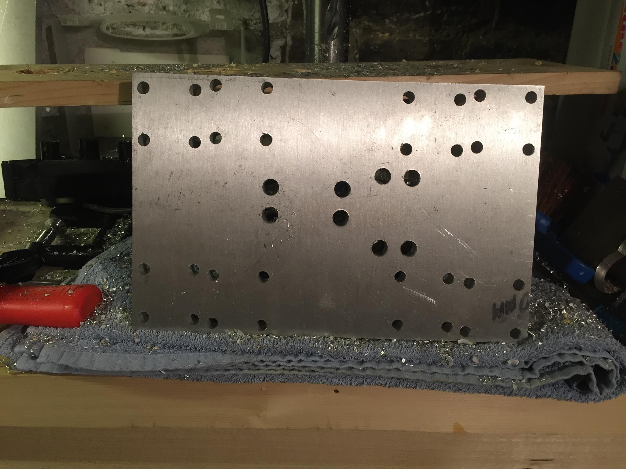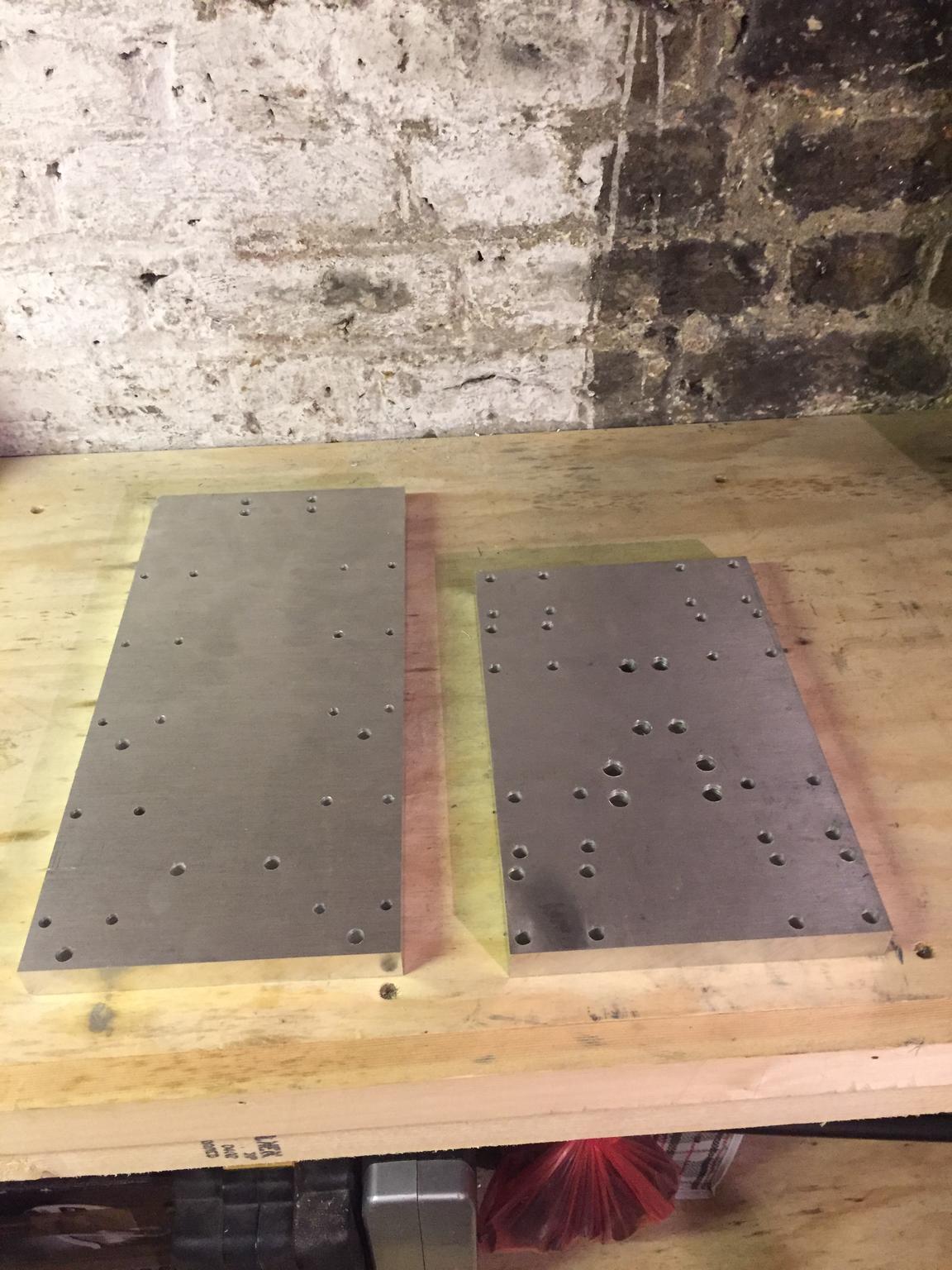 The two plates with all the holes drilled. All look to be in the right place. I'm fairly happy with how fairly straightforward this was. It was working with aluminum that was most unsure about as I have no real experience working with it. It's just like drilling wood but smoother!