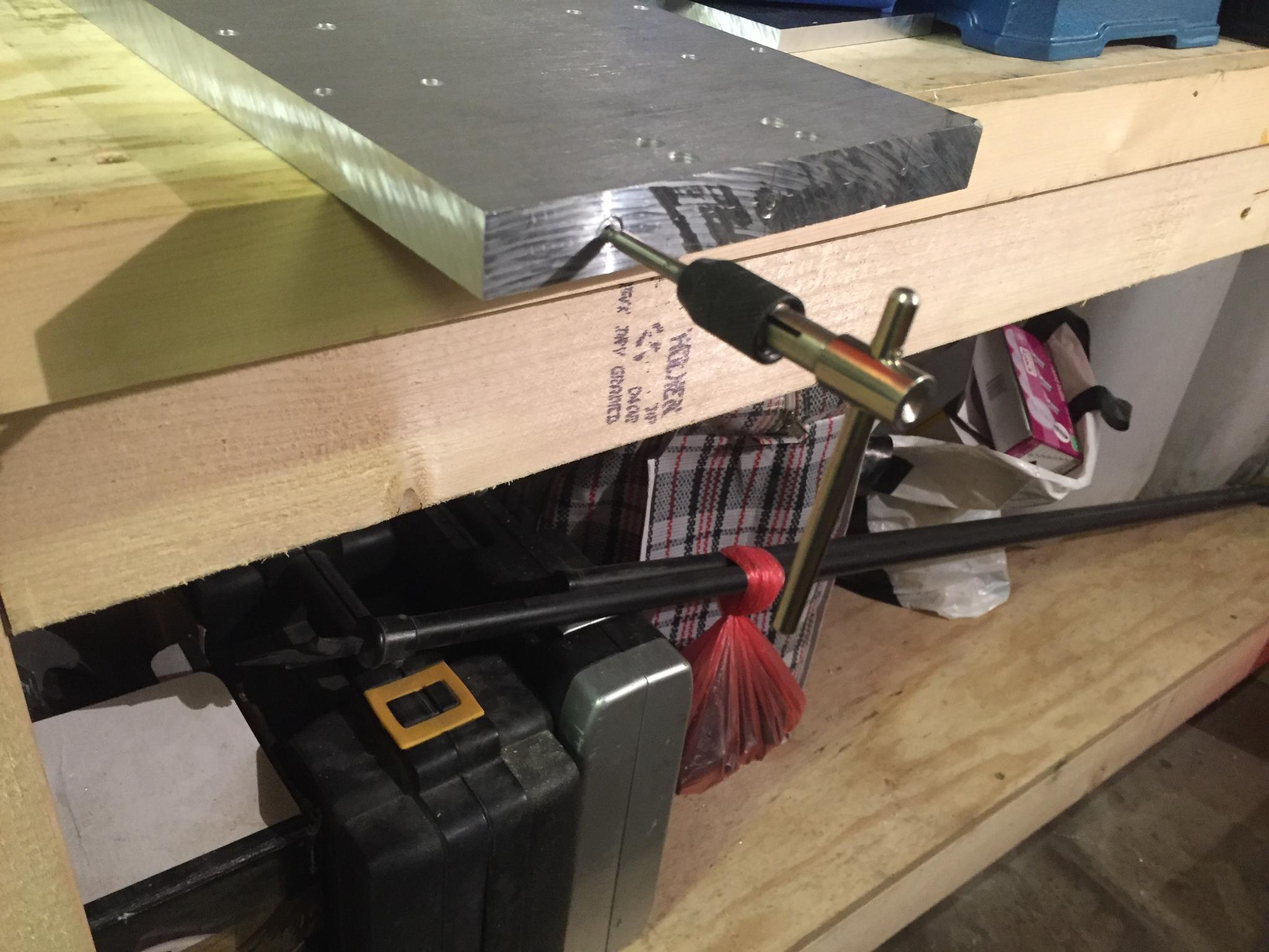 After marking through the holes on the stepper bracket mount with a transfer punch, I drilled them with a tap drill (4.2mm) for an M5 tap. This was the first of many taps. My advice to anyone attempting their own build is to buy a decent tap wrench and set of taps. I started off with the one seen here which came as a set with a set of taps and dies. It was bloody hard work, the handle kept falling off and eventually later on a cheap tap snapped off and remains in a hole on my build. I paid out for a snap on M5 and M6 tap and tap wrench. Probably cost the best part of £30 but one of the best purchases in hindsight and made the build a hell of a lot easier. As you'll see later there are plenty more holes to be tapped yet.