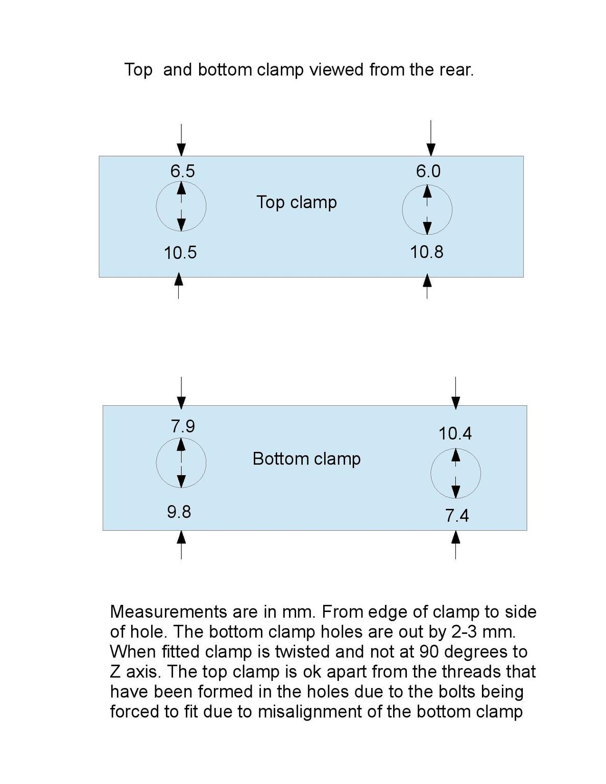 Hi, Received my 6040 a couple of weeks ago via Germany. There are a few things to iron out but have managed to cut some wood! The machine arrived in one box fully assembled apart from stepper motors. On unpacking found the machine was on its side. I am using USBCNC (Planet).*800 watt spindle The main issue at the moment is with the spindle clamps. I noticed that the spindle was not at right angles to the z axis. I undid the clamp bolts but found that the spindle was jammed. After releasing the other two bolts the spindle came free. The top clamp appears ok however the holes in the bottom clamp are out of line it looks as though during manufacture the drill has wandered offcourse? (hopefully drawing attached) The top clamp holes are threaded? I can only assume that during assembly the bottom clamp was fitted first and as it was out of line force was used to bolt on the top clamp cutting the thread. I have been in touch with the vendor but I dont think he agrees with my thoughts. A learned opinion from one of the forum members would be very much appreciated.