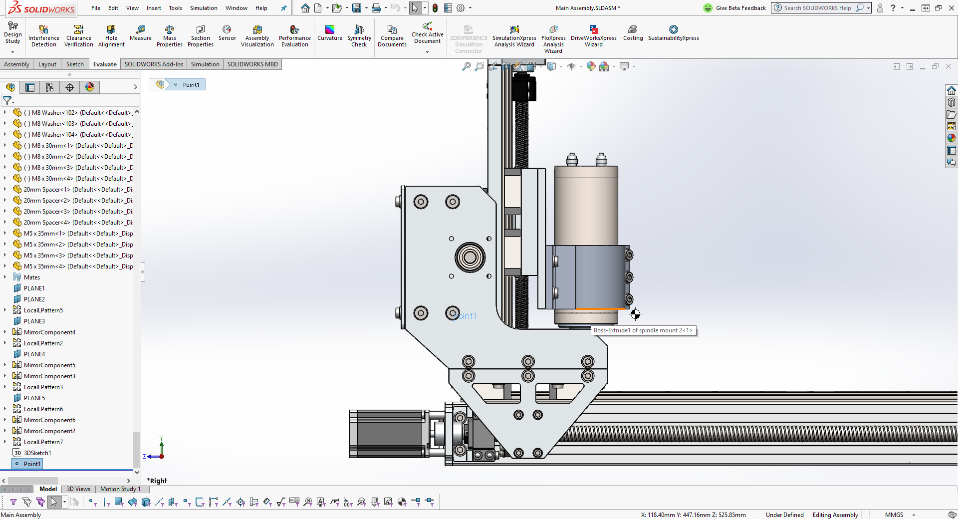 Ok, so the Axis is orientated as is to try and get the maximum workable area within that size of frame, i could have made it more central "looking" but in reality its not really central because on one end of the axis the spindle can reach past the machine, and on the other end you have a few hundred mm of area that you cannot reach, this is why i have tried to balance it and make the most of the space available. I'm nt sure of the weight of the spindle but this is obviously very important in order for Solidworks to calculate the centre of mass, i had read online that in general a 2.2Kw spindle will weigh in the region of 5Kg. So i set that as the mass of the spindle and run the evaluation, and it came out pretty well imo, more than acceptable to me, the linear rails and carriages im using are supposed to be high quality so im hoping that they will be fine: