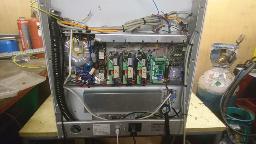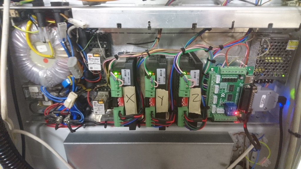 I had a quiet day went and wired electronics, I have used a KK01 BoB, CWD556 drivers, a UC100 motion control ( but bloody thing keeps dropping out no blue light) I have used 3 of the windings on origional transformer I built a couple of rectifiers to drive the E-Stop and limits through a couple of relays