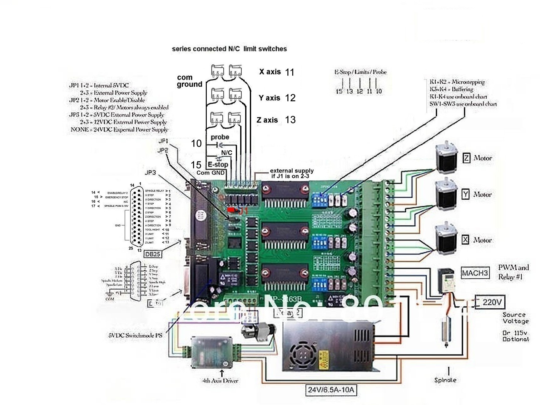 My problem is I have JP-3163B ver 3.9 motion controller board,On one side it has these connections--> VCC/XXW/XYW/ZXW and on the other C/NO/0-10V/ GND now please tell me do i need to place the 2 wires per limit switch for eg.for the X axis -->Com and NC wires in the XXW slot and Y axis Com and NC in the XYW and same for the Z axis in the ZXW or only NC wire in each of them and all the COM wires in the VCC slot?