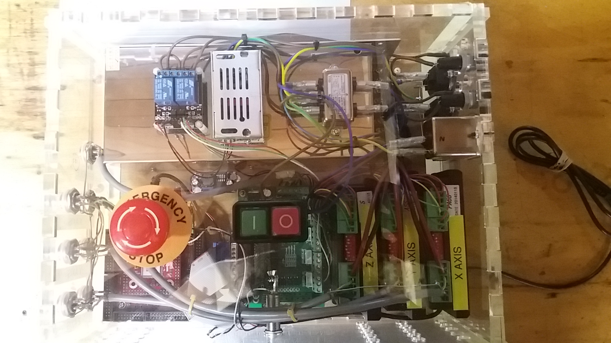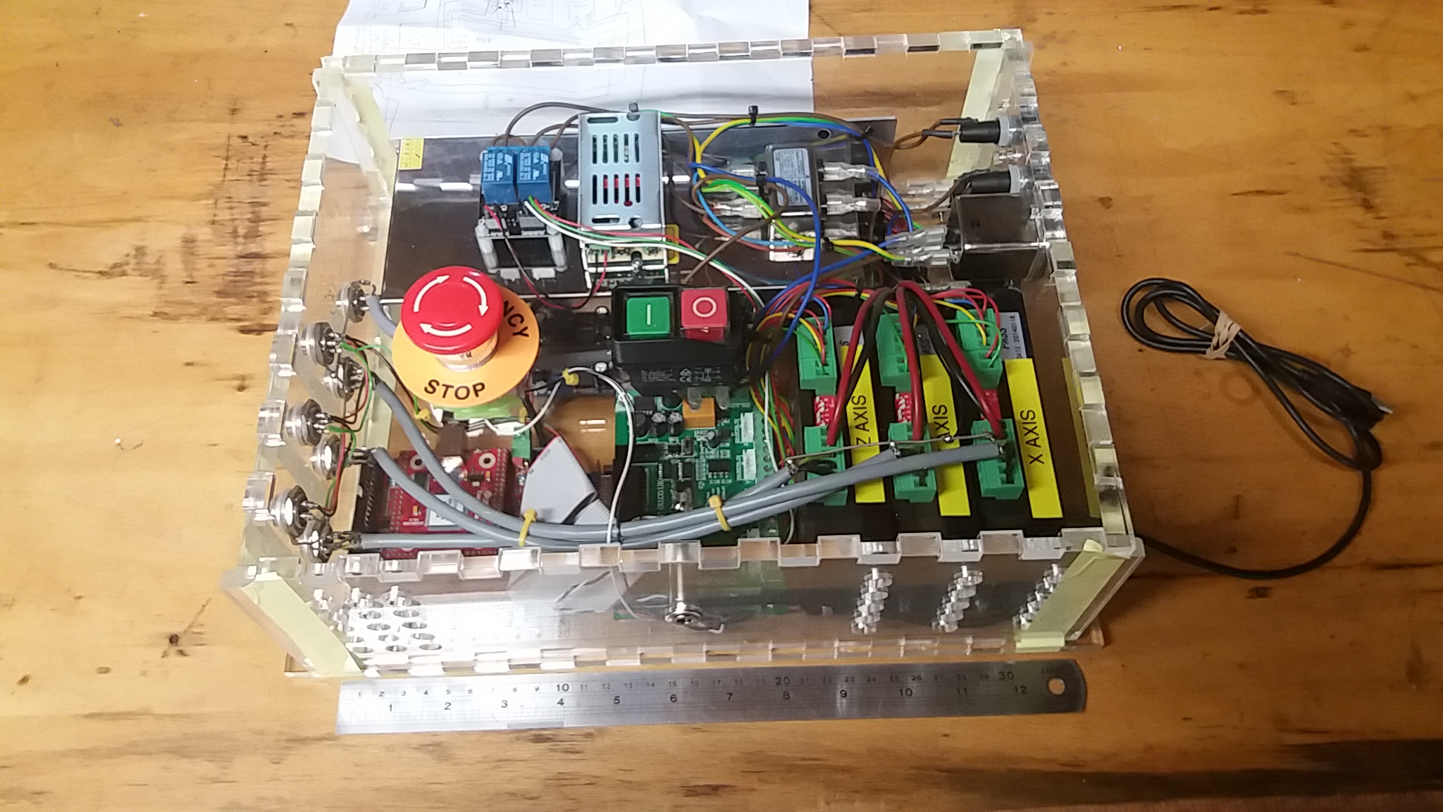 plus relay board to switch mains to control water pump, spindle & 1 spare. emergency stop no volt switch and z axis stop jack