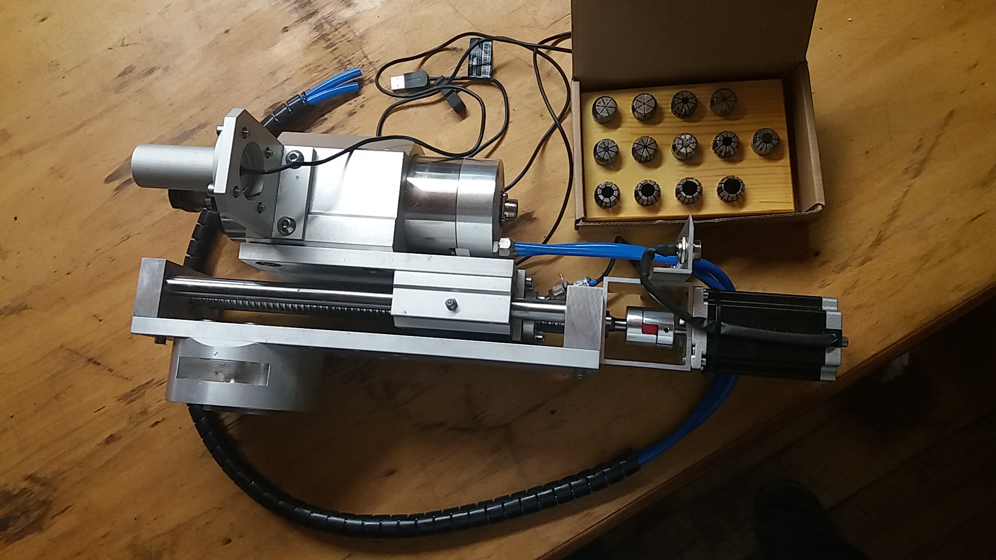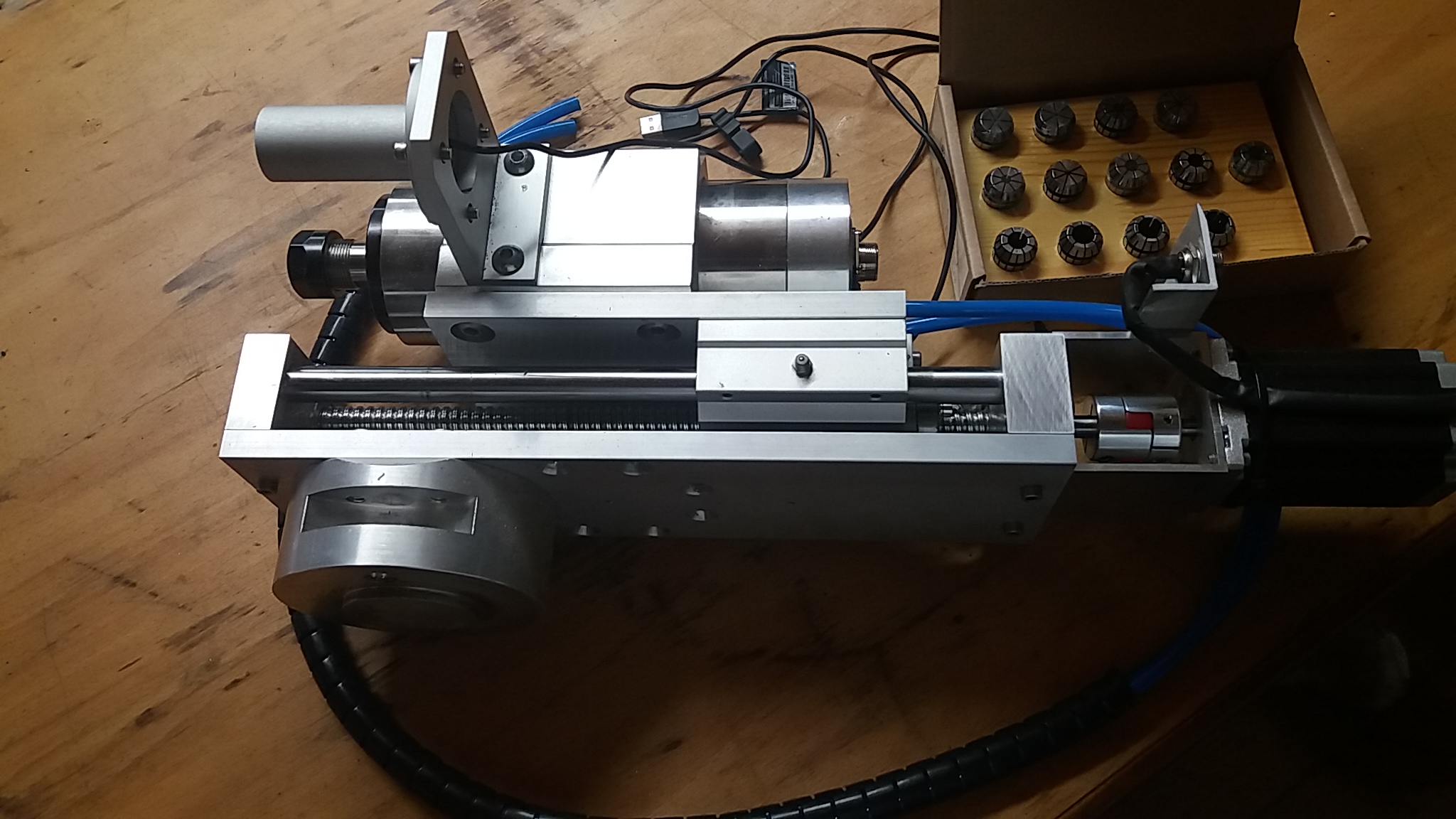 this is the spindle mounted on a zero backlash ballscrew. It comes with a water pump and variable speed controller. all bought from cnc4u as a system so designed to work together. also a set or er20 ncollets, some unused.
