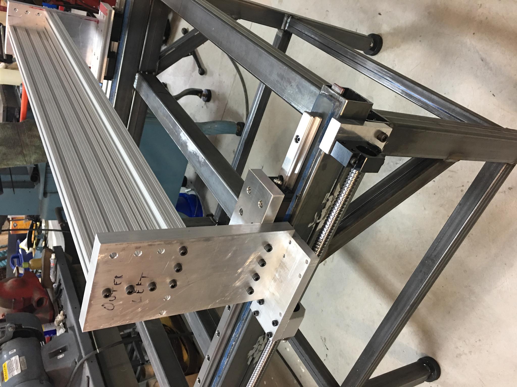 I just ordered rails and ballscrews that are 50mm longer than the ones in the pics. I intend to move the existing ones to the gantry and put the new ones in their place. This should give me bit more travel and get the ends out where I can get pulleys on them. I am thinking of driving the two Y-axis screws with a single NEMA 34 and timing belt arrangement. The X- and Z-axes will be NEMA 23.