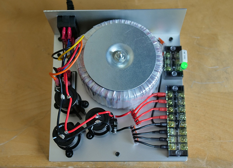 The transformer is 24V-24V, it gives me 70V output with the driver connected. 3x capacitors 4700uf, 100V, 105deg. Bleeder resistor is 3K9 5W with Led in series. With nothing connected is discharges the capacitors completely in around 4 mins. With one driver, in 7 seconds. Slow blow 5A fuse in the 240V input.